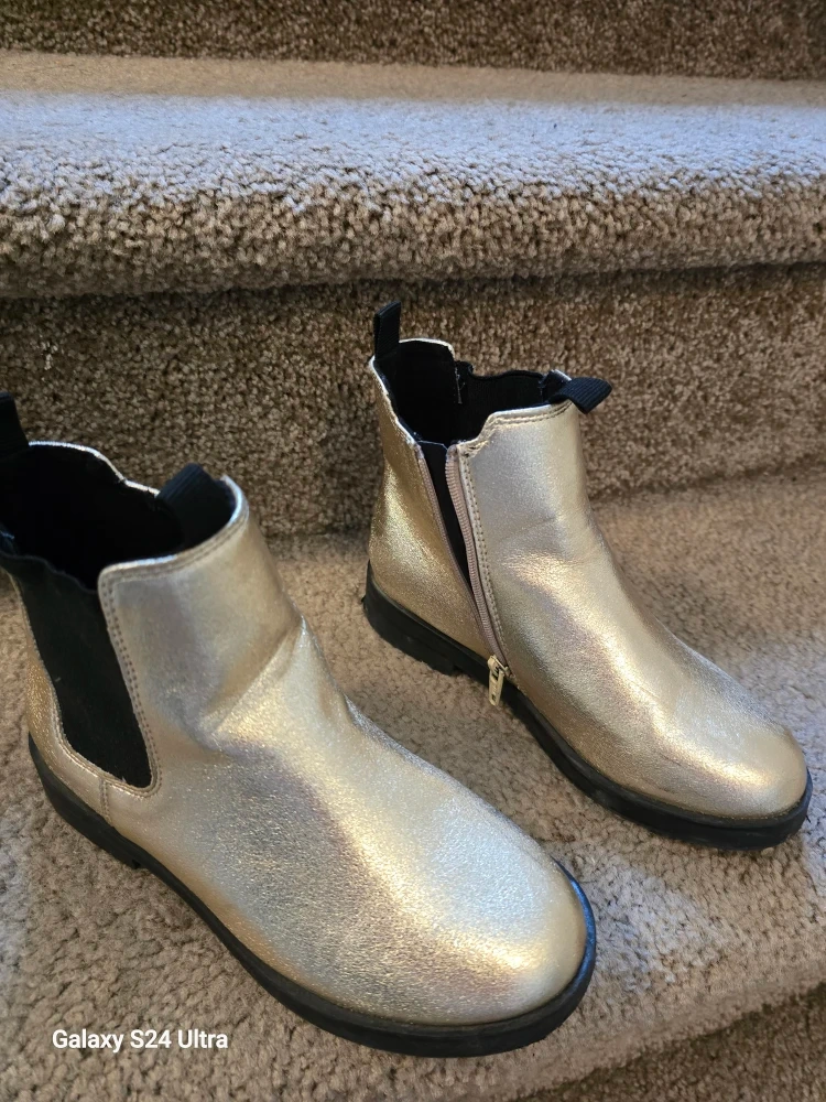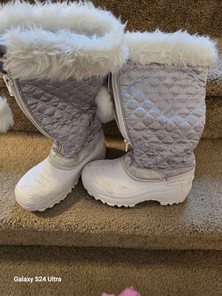 10Selling a pair of Gray Wolf snow boots in a kids size 1. They're in good condition and ready for some winter fun! Gold boots for little girl. Size is 13C