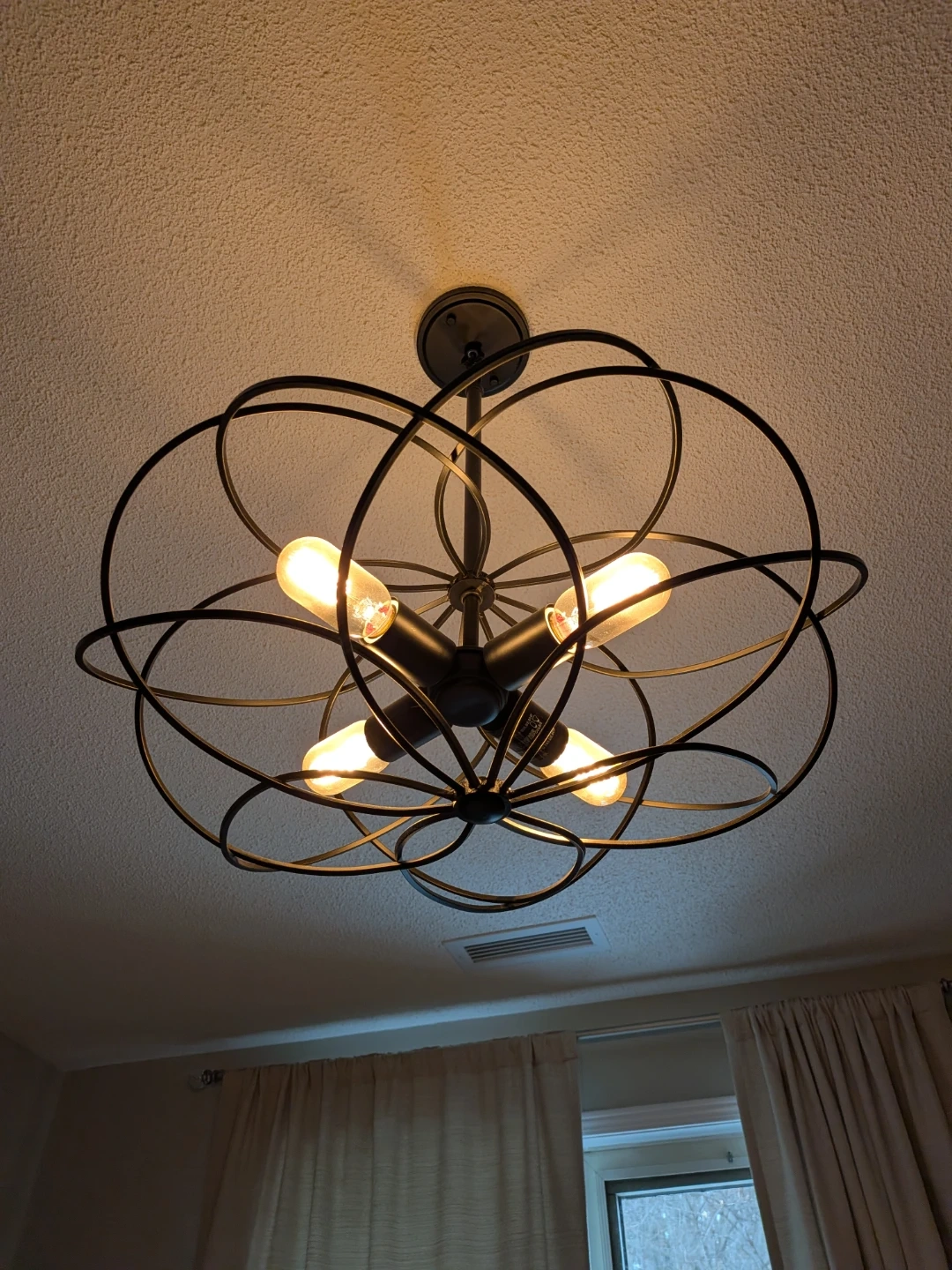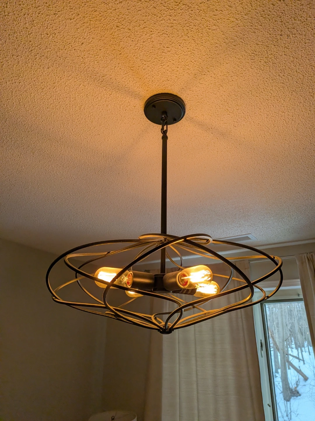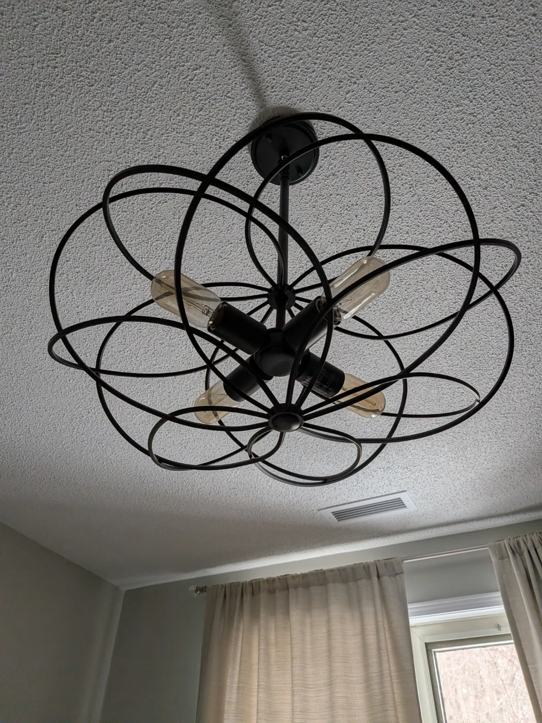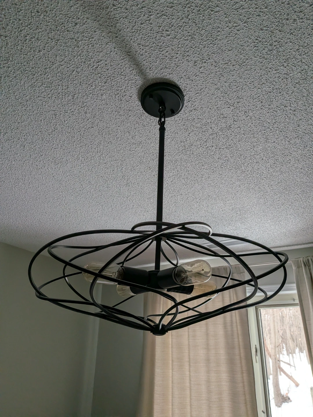 Four-light black metal chandelier with a unique geometric design. It's finished in a matte black. Adds a modern touch to any room.