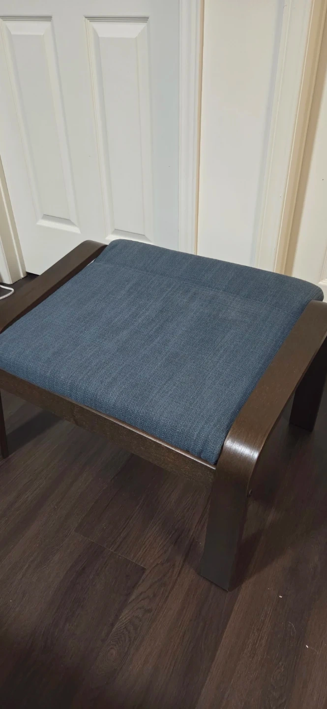 Comfortable ottoman with a blue fabric seat and a dark wood bentwood frame. It's a stylish addition for any living space. This ottoman is great for resting your feet.
