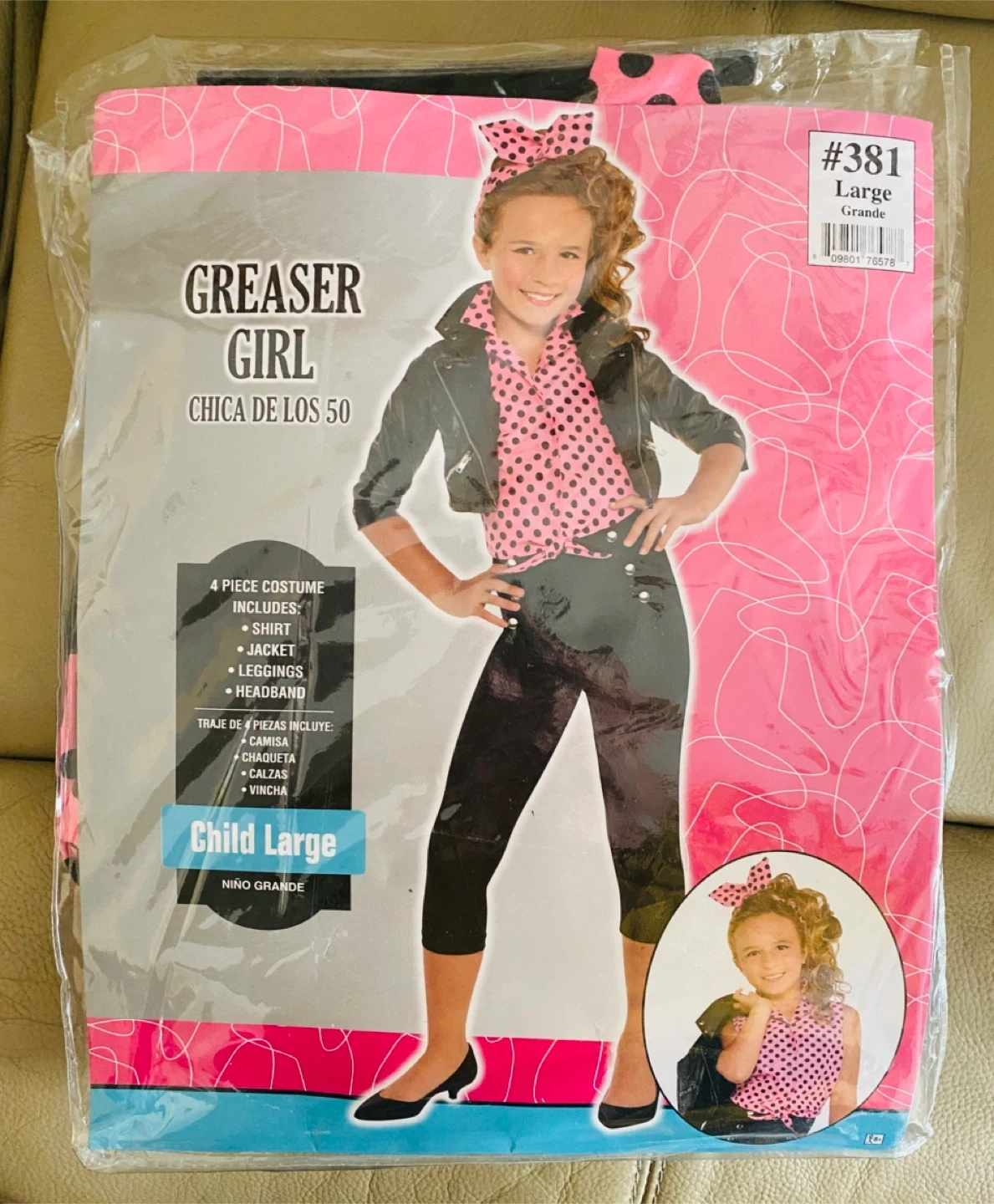 76Selling a Greaser Girl costume in child size large. This 4-piece costume includes a shirt, jacket, leggings, and a headband. It's perfect for dress-up or Halloween!