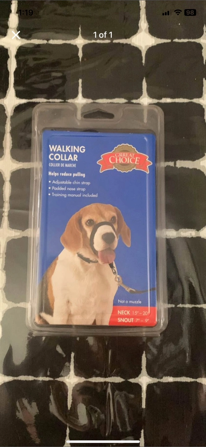 Selling a Great Choice Walking Collar still in its original packaging! It's designed to help reduce pulling with features like an adjustable chin strap and padded nose strap. A training manual is also included. It fits dogs with a neck size of 15-20 inches and a snout size of 7-9 inches