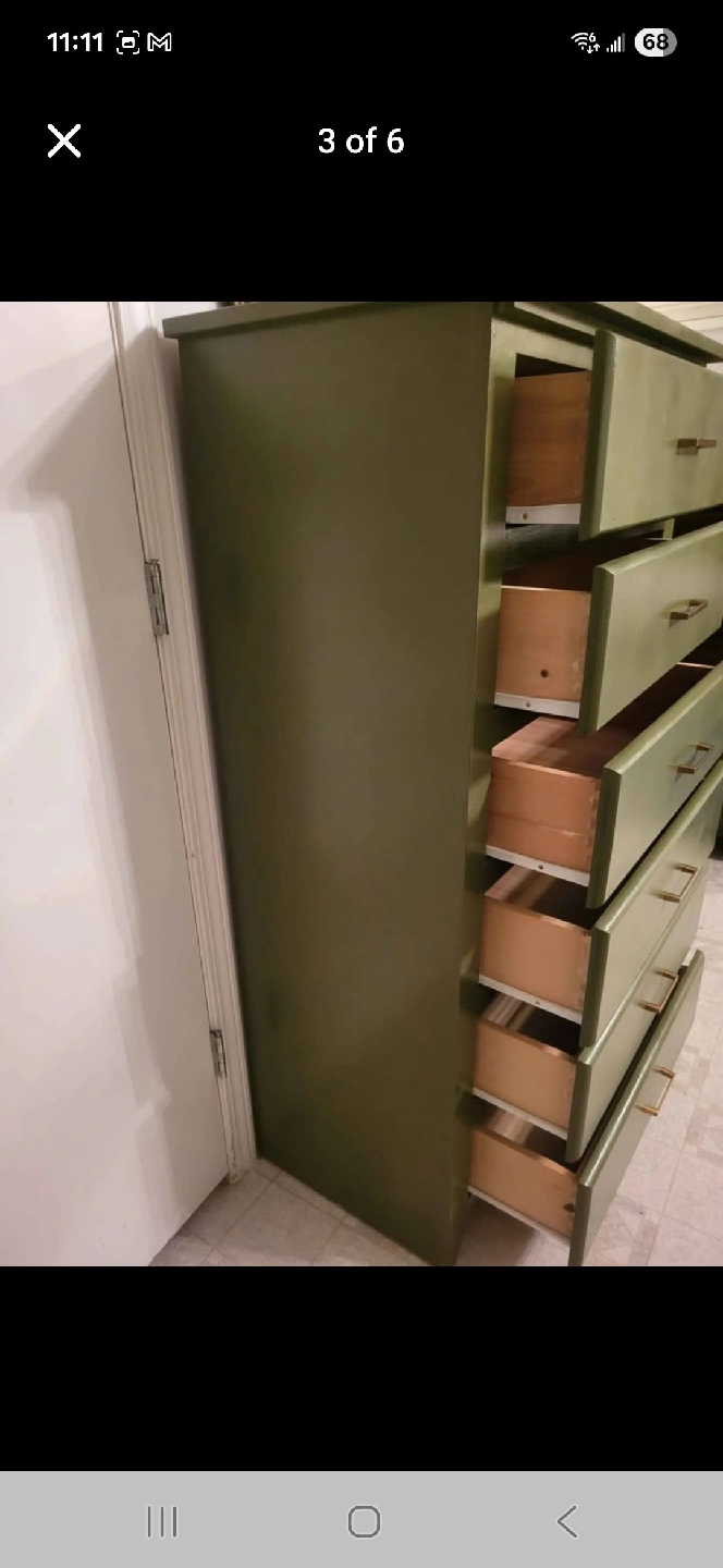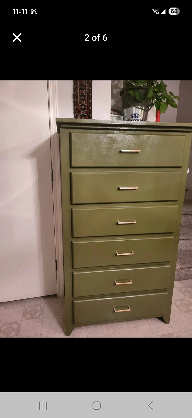 Selling a green 6-drawer dresser. It's a great piece for adding storage and a pop of colour to any room. The drawers slide smoothly, making it easy to access your clothes and belongings.This wooden dresser is refinished in amazon green color.