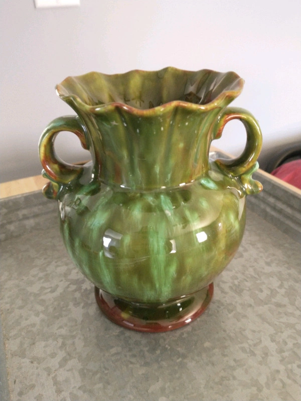 15Beautiful green and brown pottery vase by Huffman. 7 inches tall. Porch pick up near Lesperance and the Expressway.
