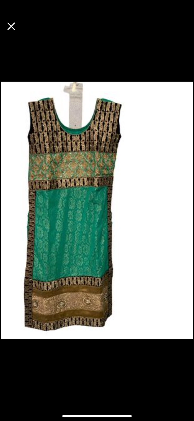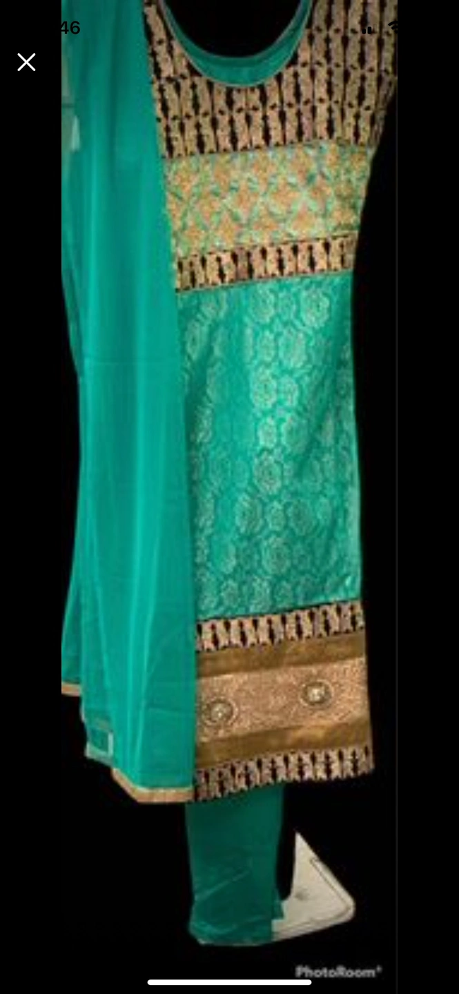 Green and gold with velvet and net material used in this Indian suit with gold and black embroidery. Includes pants and dupatta.