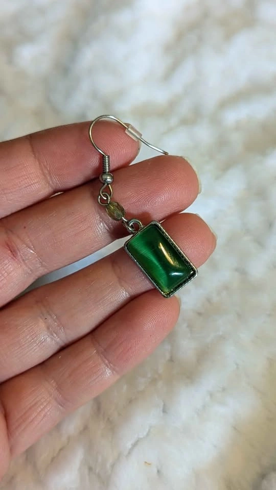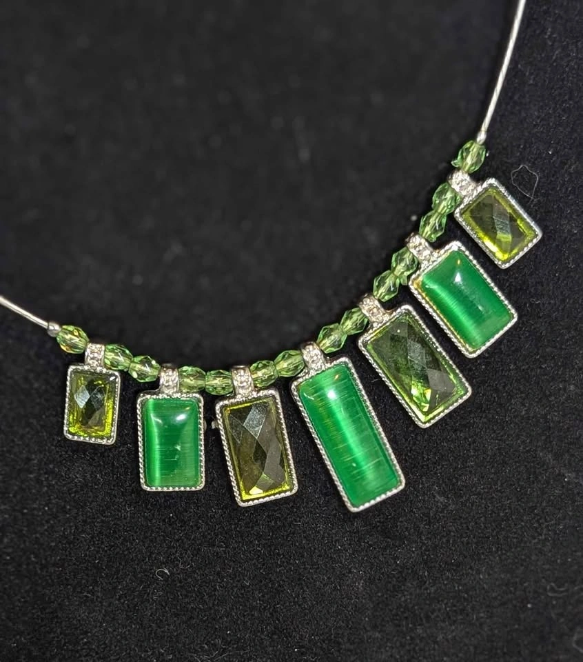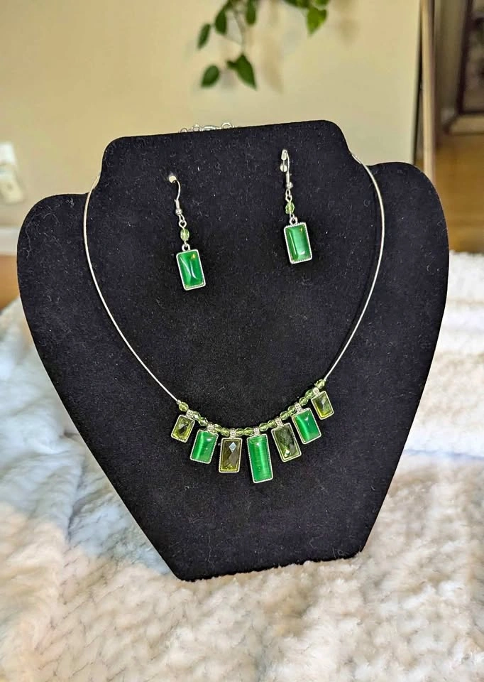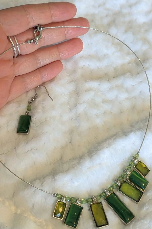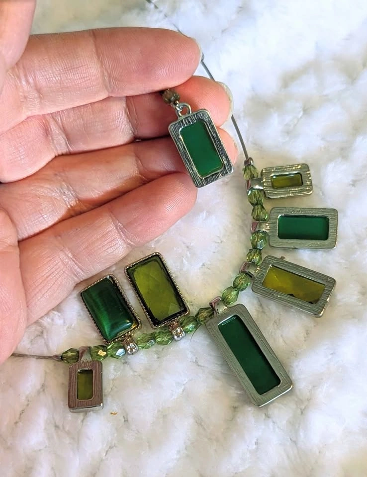 157Elegant and modern with vintage flair, this jewelry set features emerald green and olive-toned rectangular glass stones in a sleek silver-tone setting. The faceted and cat’s-eye style stones catch the light beautifully, giving off an Art Deco–inspired vibe that’s perfect for both everyday wear and evening looks. ✨ Details: – Silver-tone metal with green glass cabochons – Necklace length: approx. 18-21" with adjustable clasp – Earrings: 1.5" drop, lightweight dangles – Excellent condition, minimal wear Perfect gift for lovers of vintage-inspired or bohemian jewelry. Adds a pop of color that feels fresh, timeless, and refined.