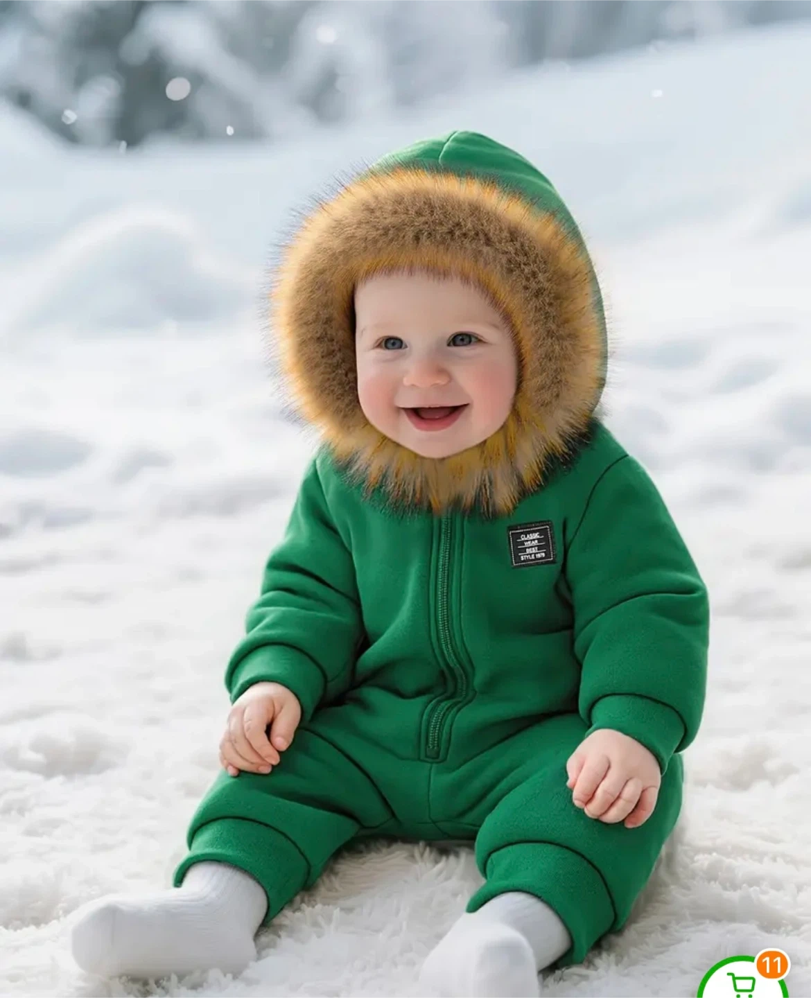 504A cozy green baby snowsuit with a fur-trimmed hood to keep your little one warm during the winter months! It looks to be in great condition and ready for some snowy adventures