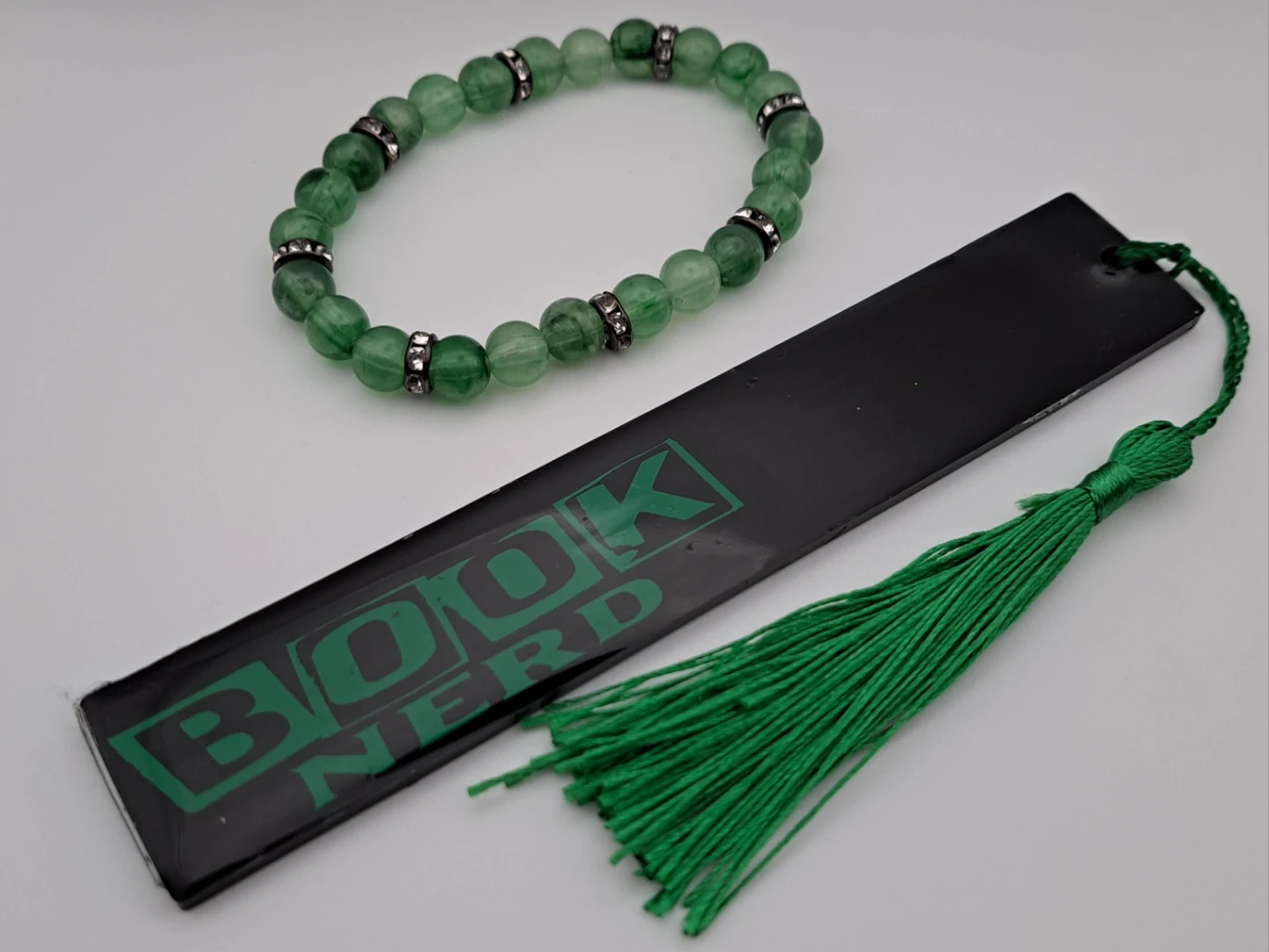 0Selling a cute green beaded bracelet, perfect for adding a pop of colour to any outfit! Also included is a 'Book Nerd' bookmark with a green tassel, ideal for any book lover