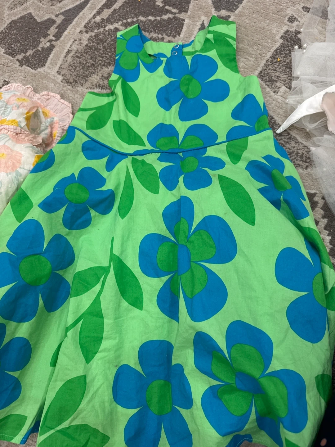 5A cute dress with a green and blue floral pattern! It's in great condition and would be perfect for a little one.