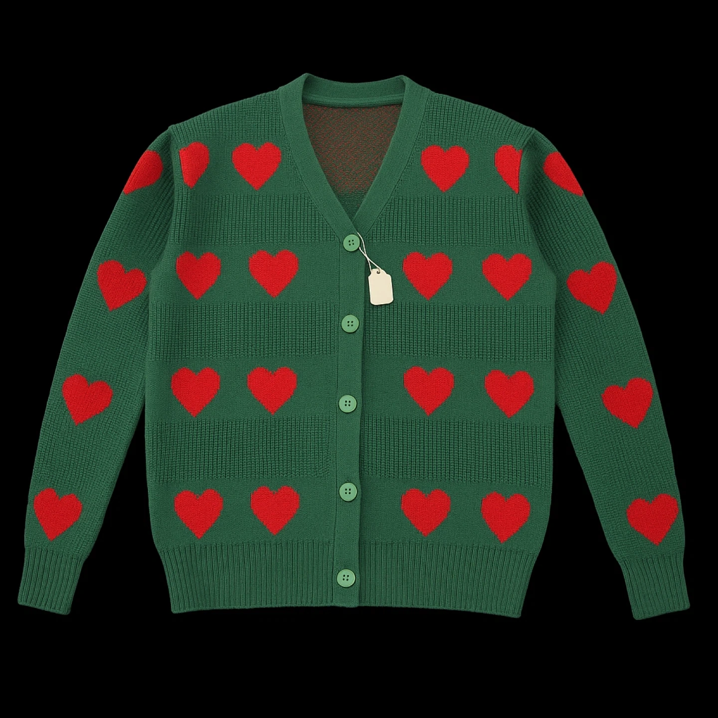 192Cute green cardigan with red heart pattern! It's in great condition and perfect for adding a pop of colour to your wardrobe. The material feels soft and cozy, ideal for layering on cooler days