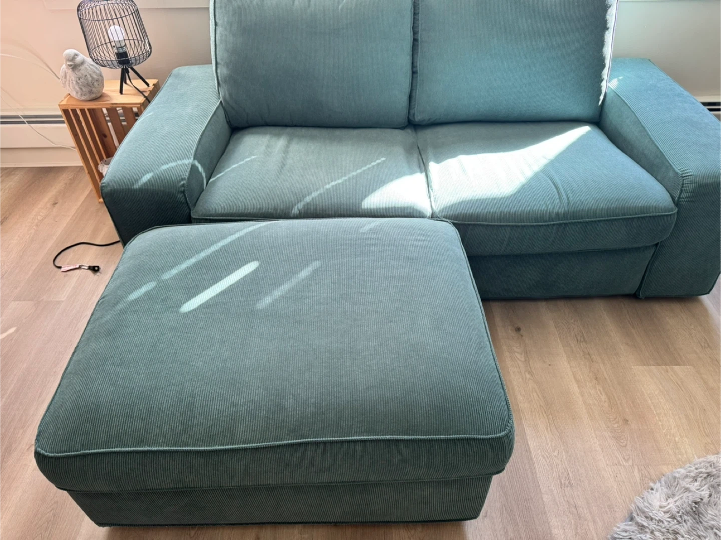 Looking to sell this comfy green corduroy ikea kivik loveseat sofa and ottoman. It's in great shape and would be a perfect addition to any living room or den. The corduroy material is soft and durable, making it a cozy spot to relax. The ottoman adds extra comfort and can be used as a footrest or extra seating