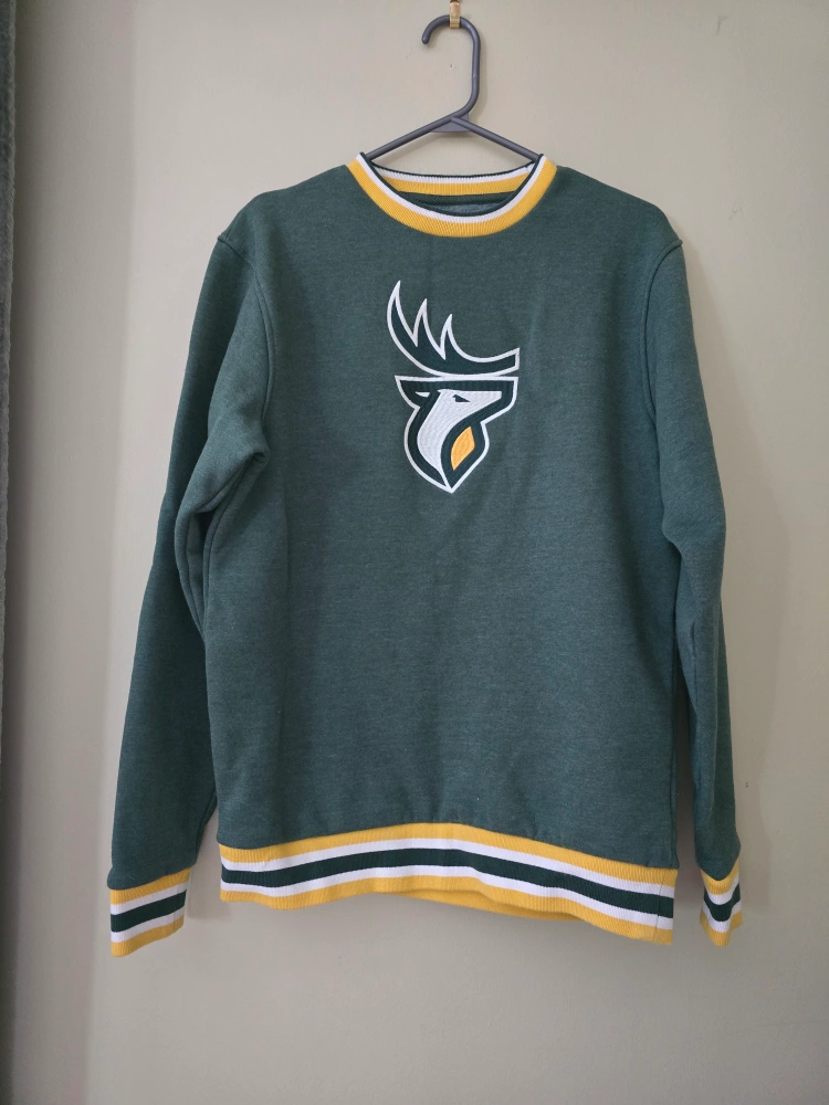 160Green crewneck sweatshirt. Features a gold, white, and green striped band at the cuffs and hem. Embroidered Edmonton Elks logo on the chest. Relaxed fit. only woren once. Too small. Brought in wrong size.