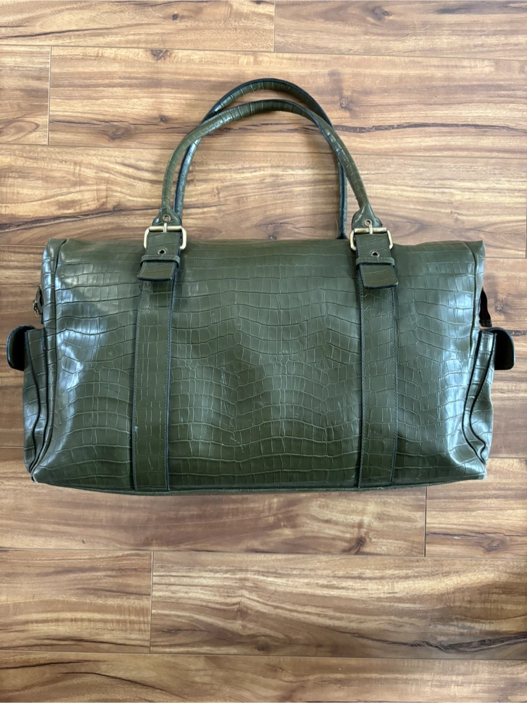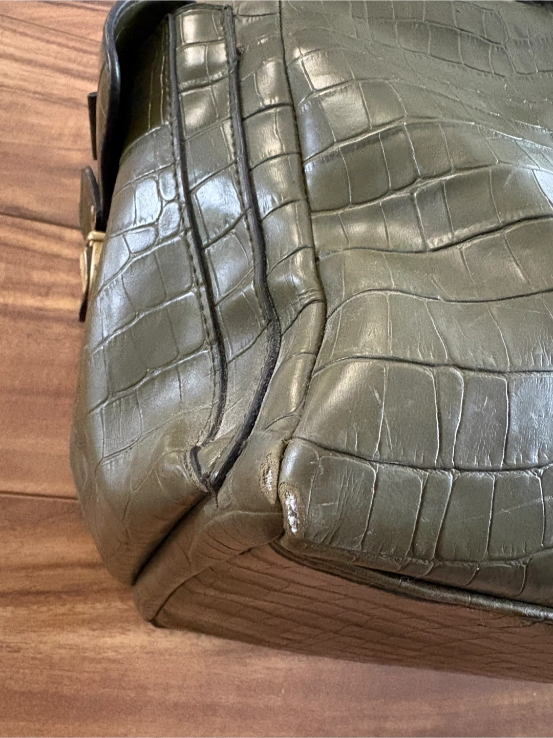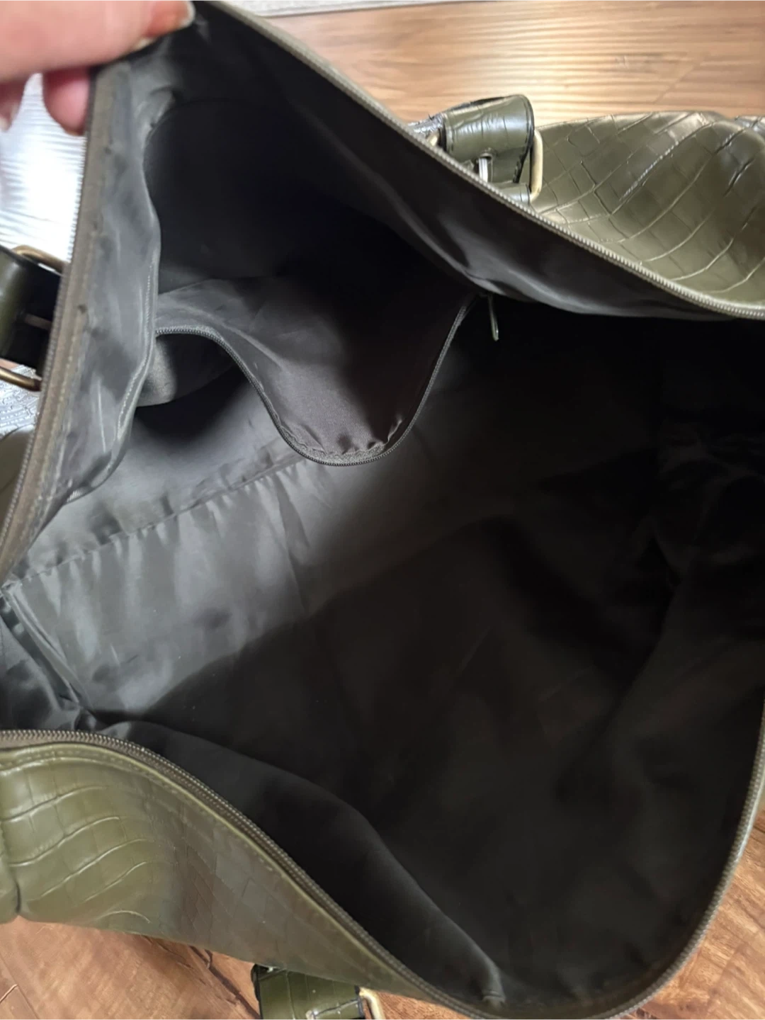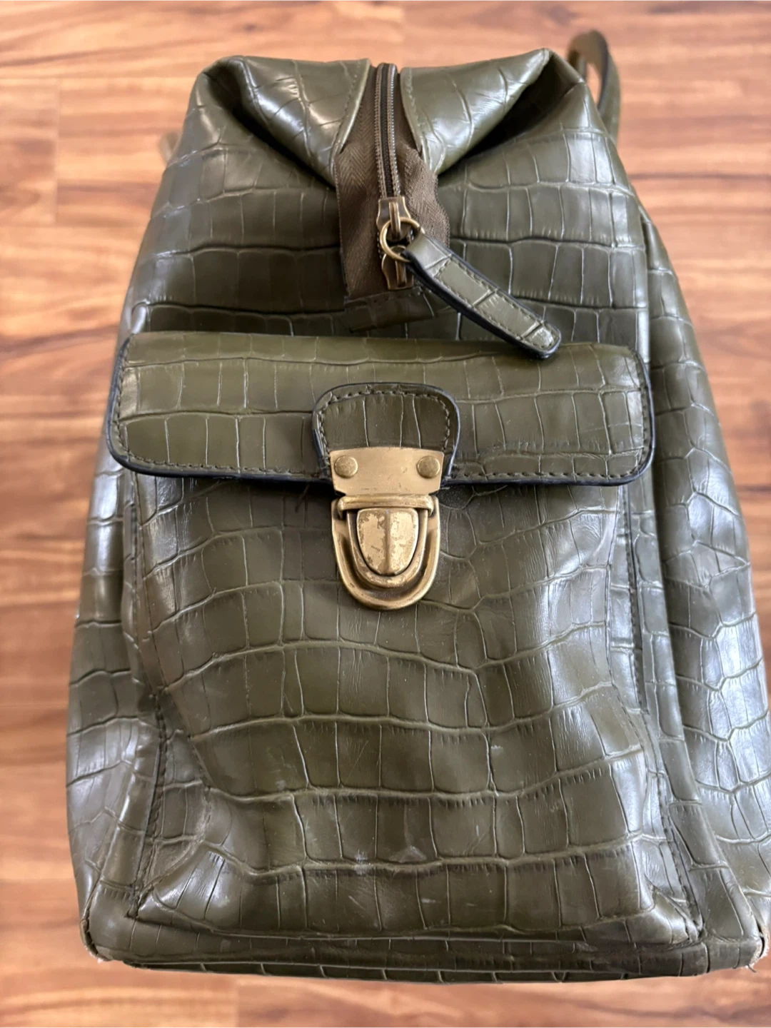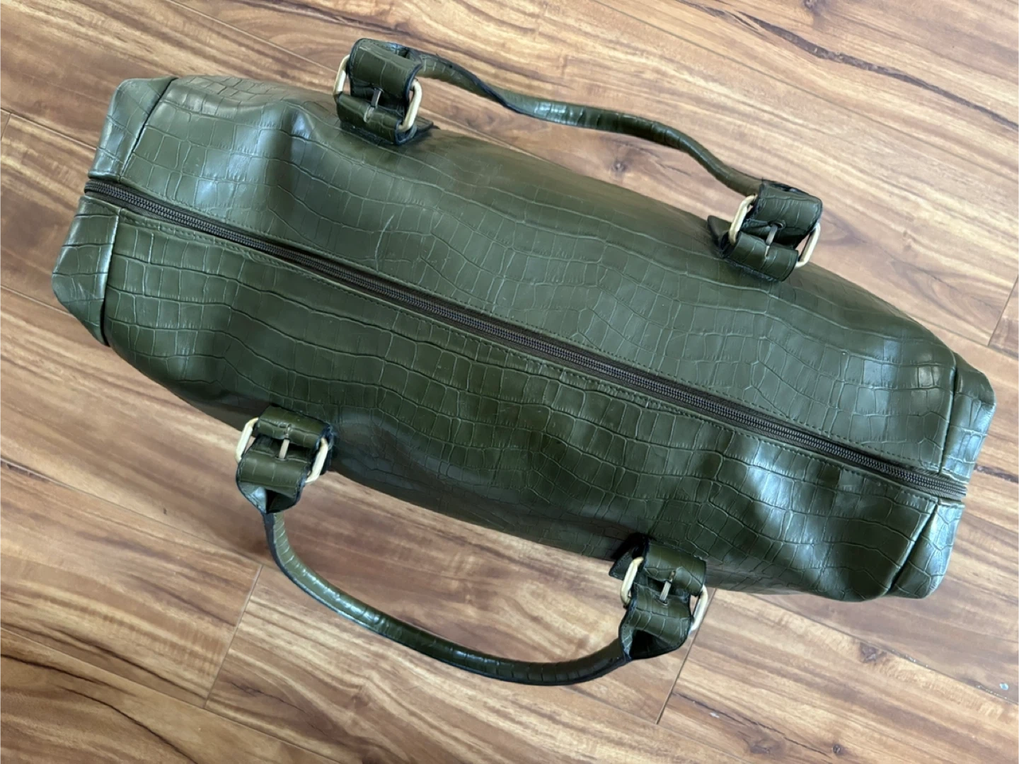 10Here's a stylish duffle bag with a unique crocodile pattern! It comes in a lovely green colour. There is some wear on the bottom corner, as shown in the photos, but still has lots of life left! Pick up in Confederetion mall or Kensington area.