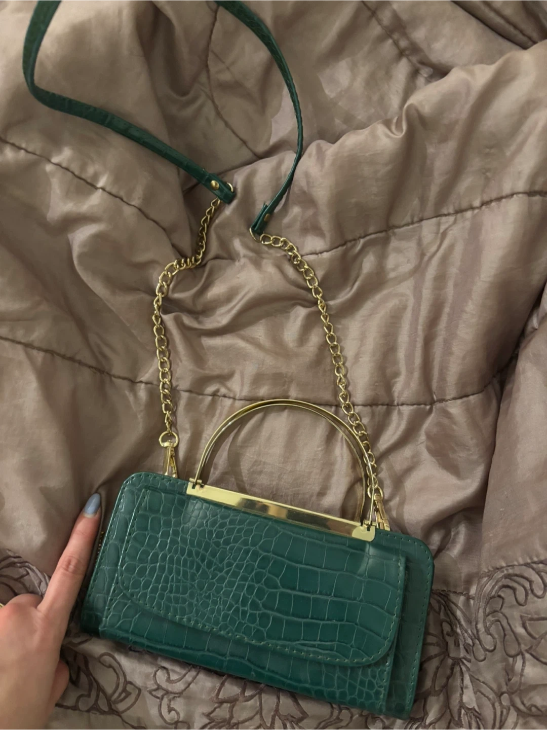 17Selling a stylish green crossbody bag with a unique crocodile print! It features a gold chain and a top handle. Perfect for adding a pop of colour to any outfit