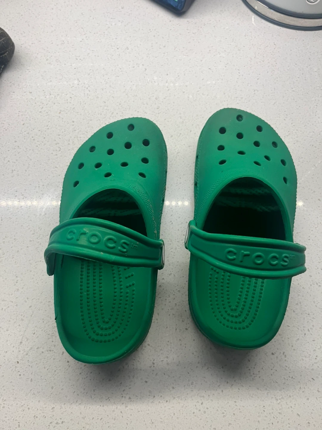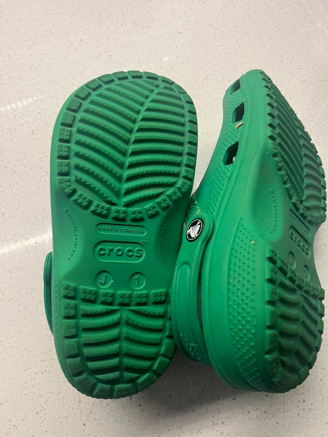 Selling a pair of green Crocs in size J1. They're in good condition and ready for a new home! Barley worn.