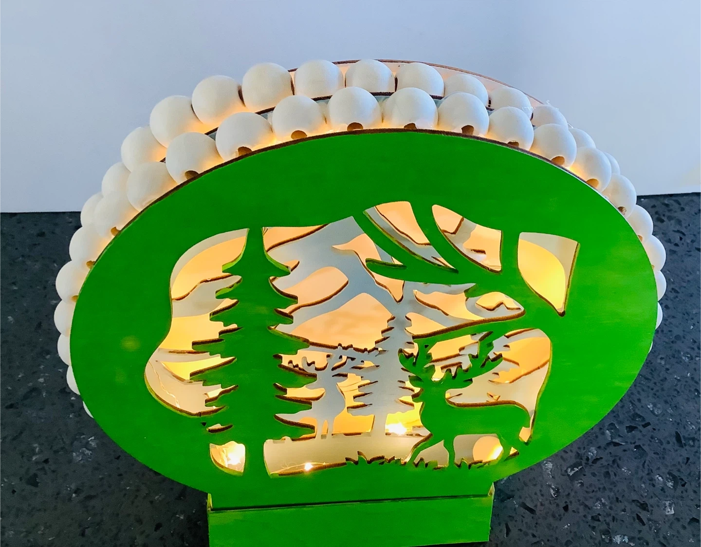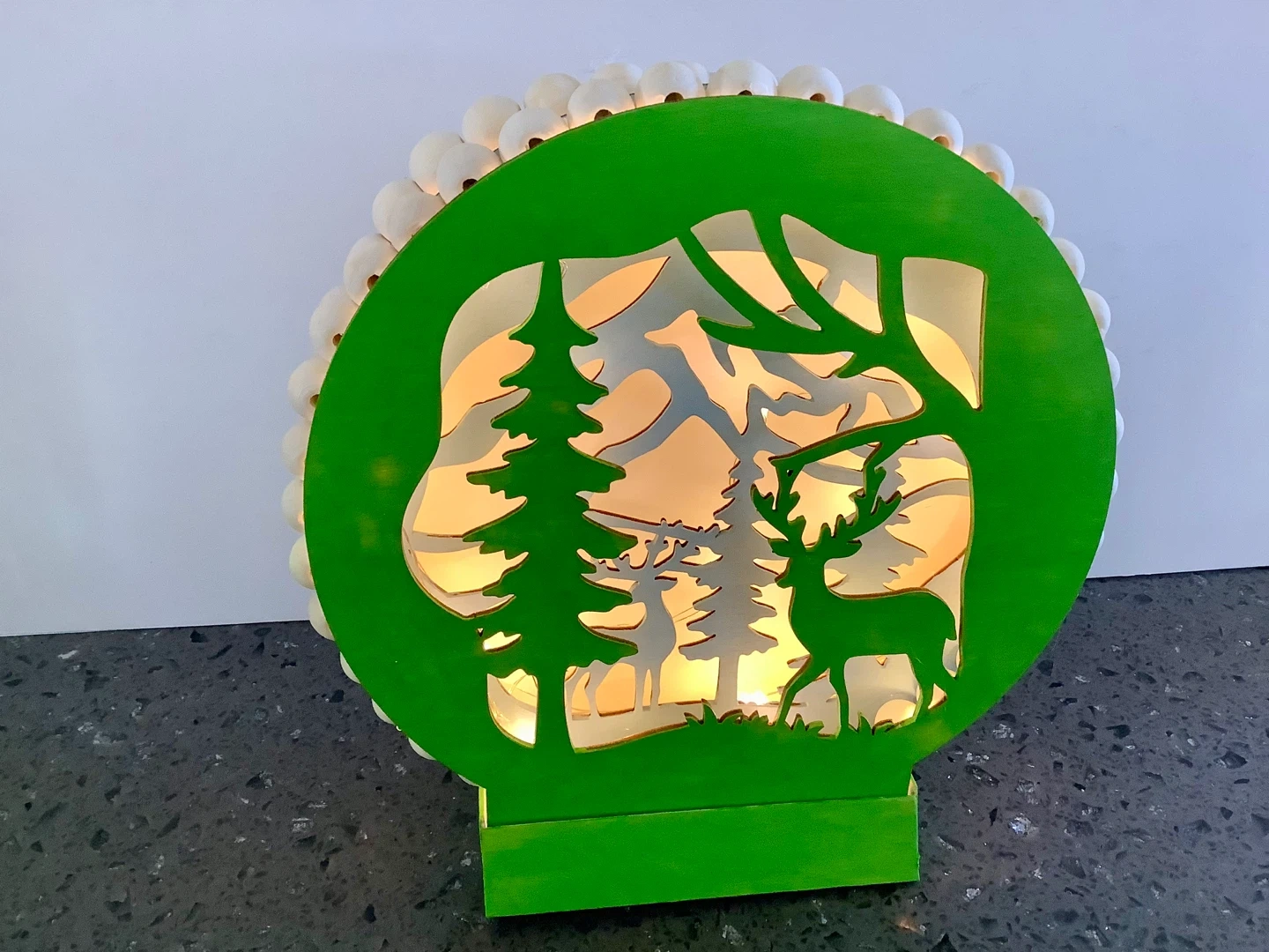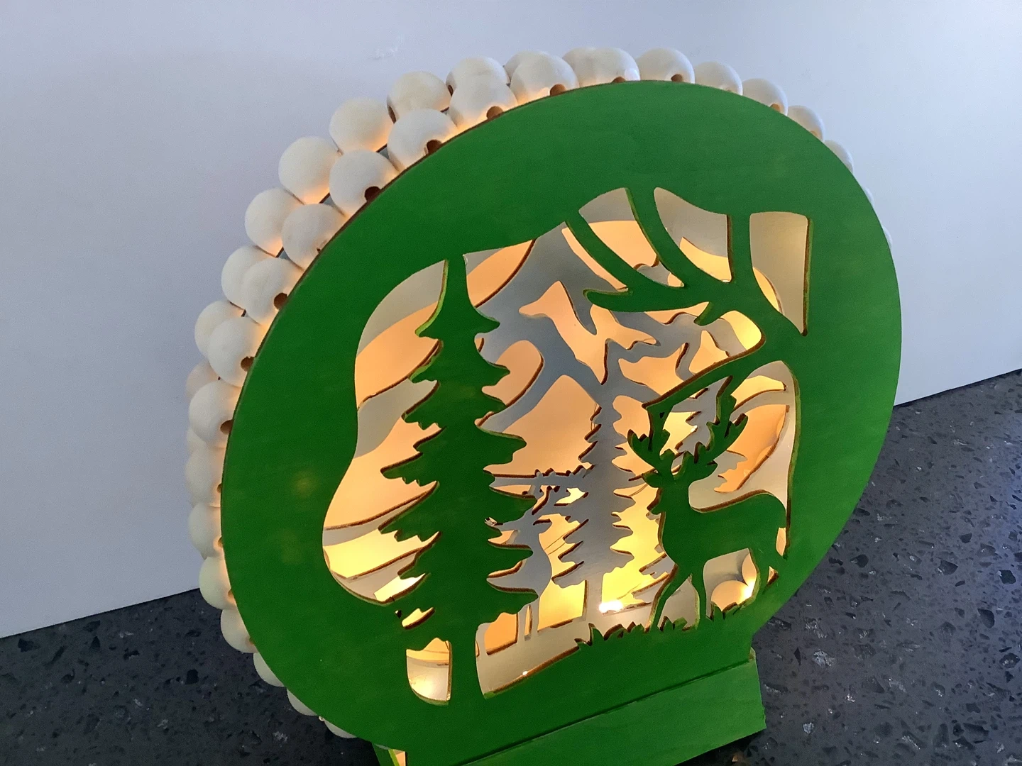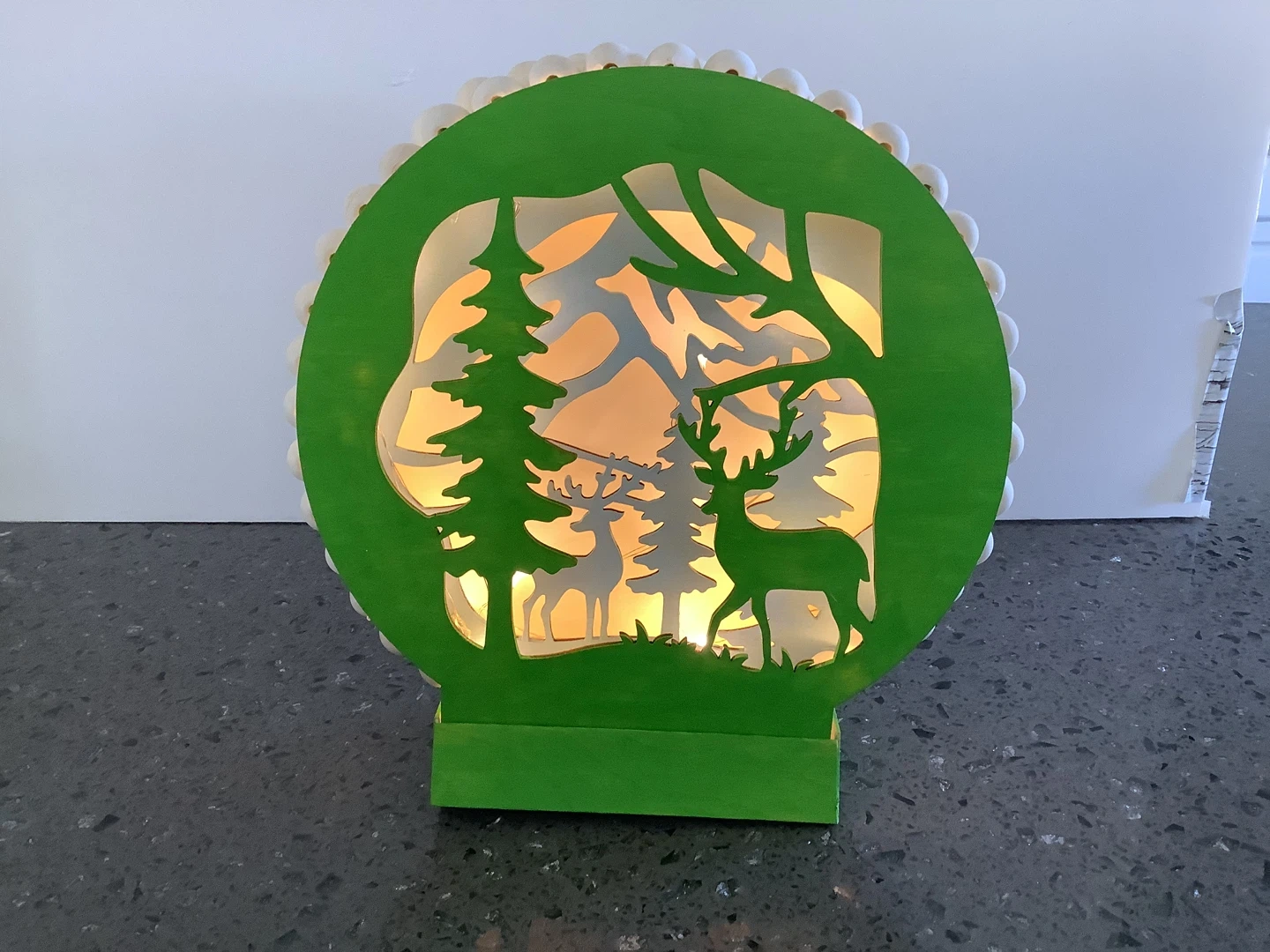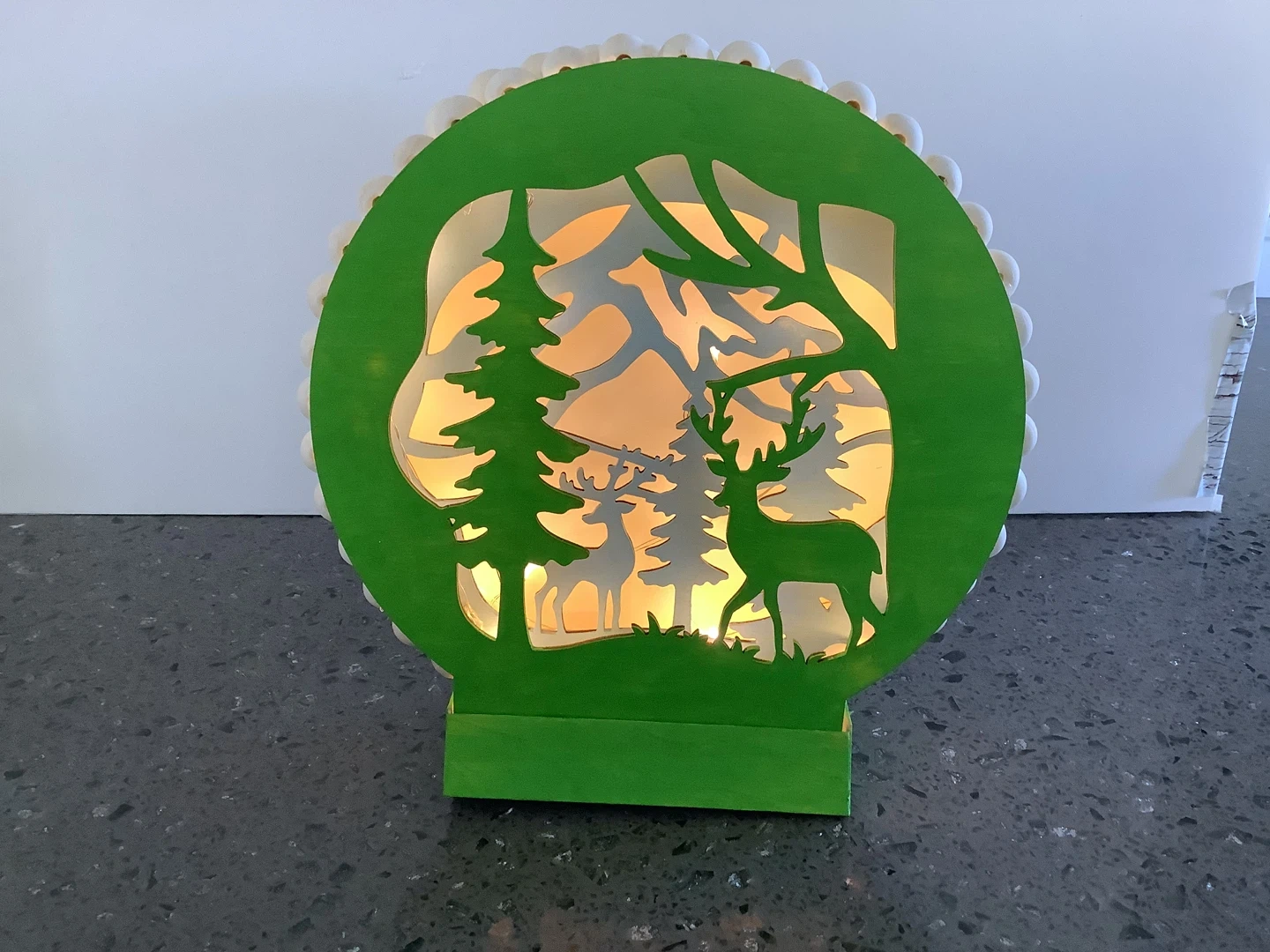 142This is a cute light-up decoration featuring a deer scene. It has a green frame and is surrounded by small, round trim. It would make a nice addition to your holiday decor. Timer lights with 6 different lighting options. Cash only One of a kind, Newly made Located at 162 ave and 78 st