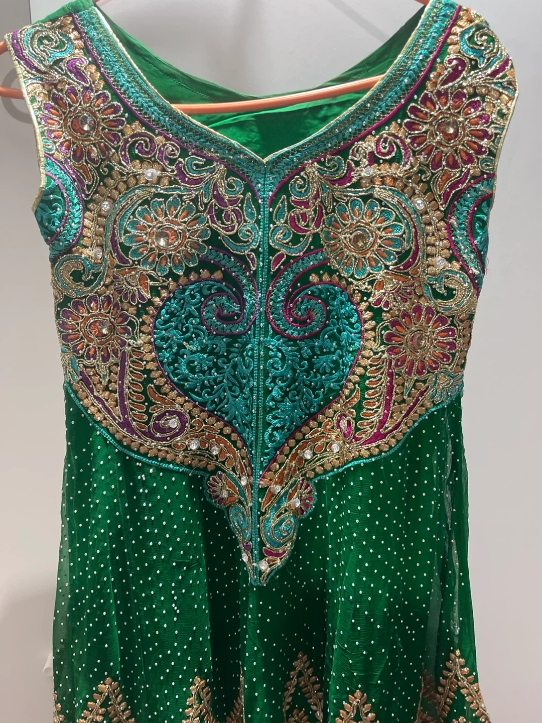 60Beautiful green dress with intricate embroidery! It's in great condition and ready for a new home. The detailed work is really eye-catching!