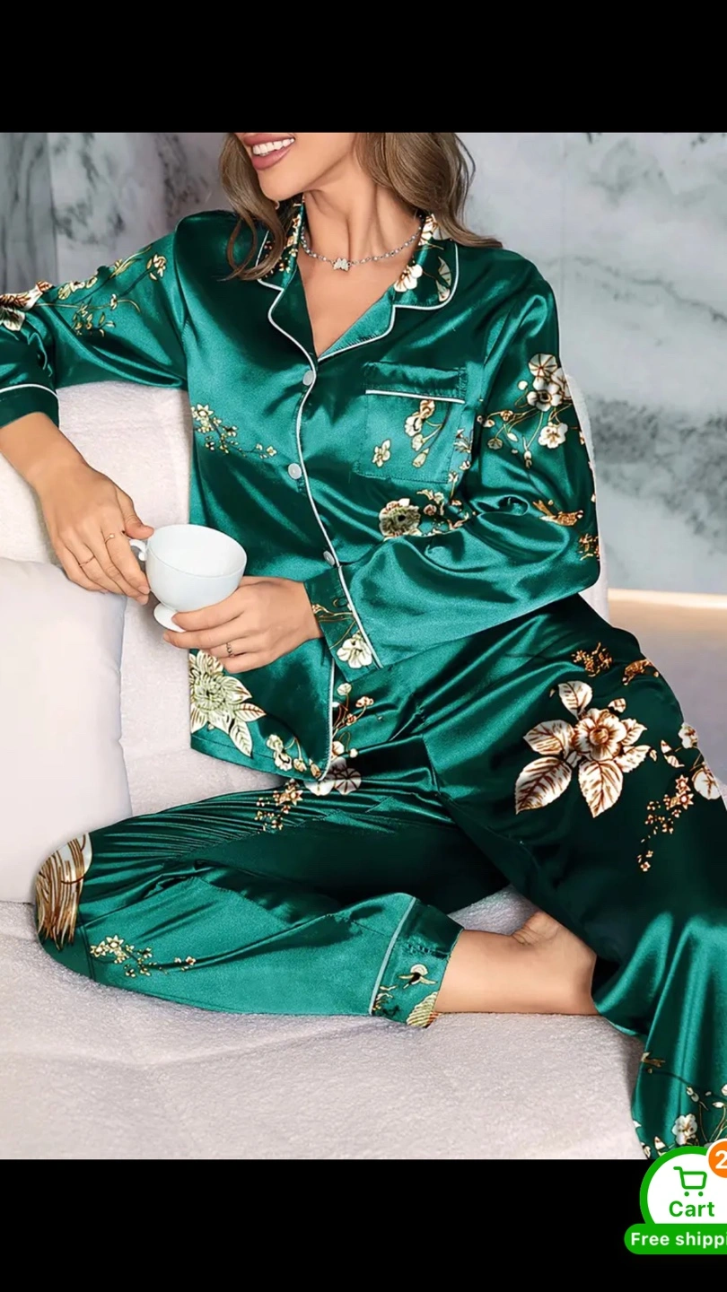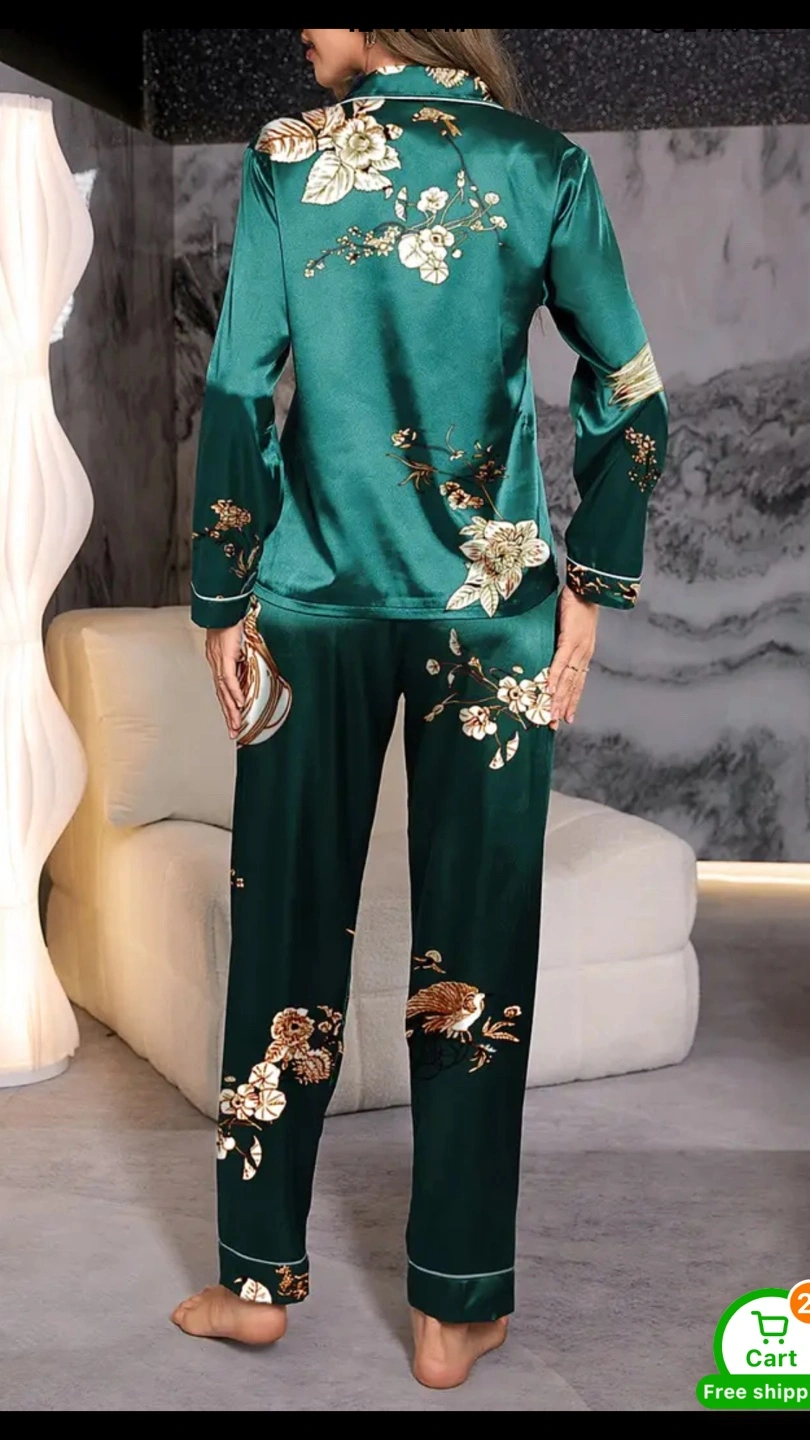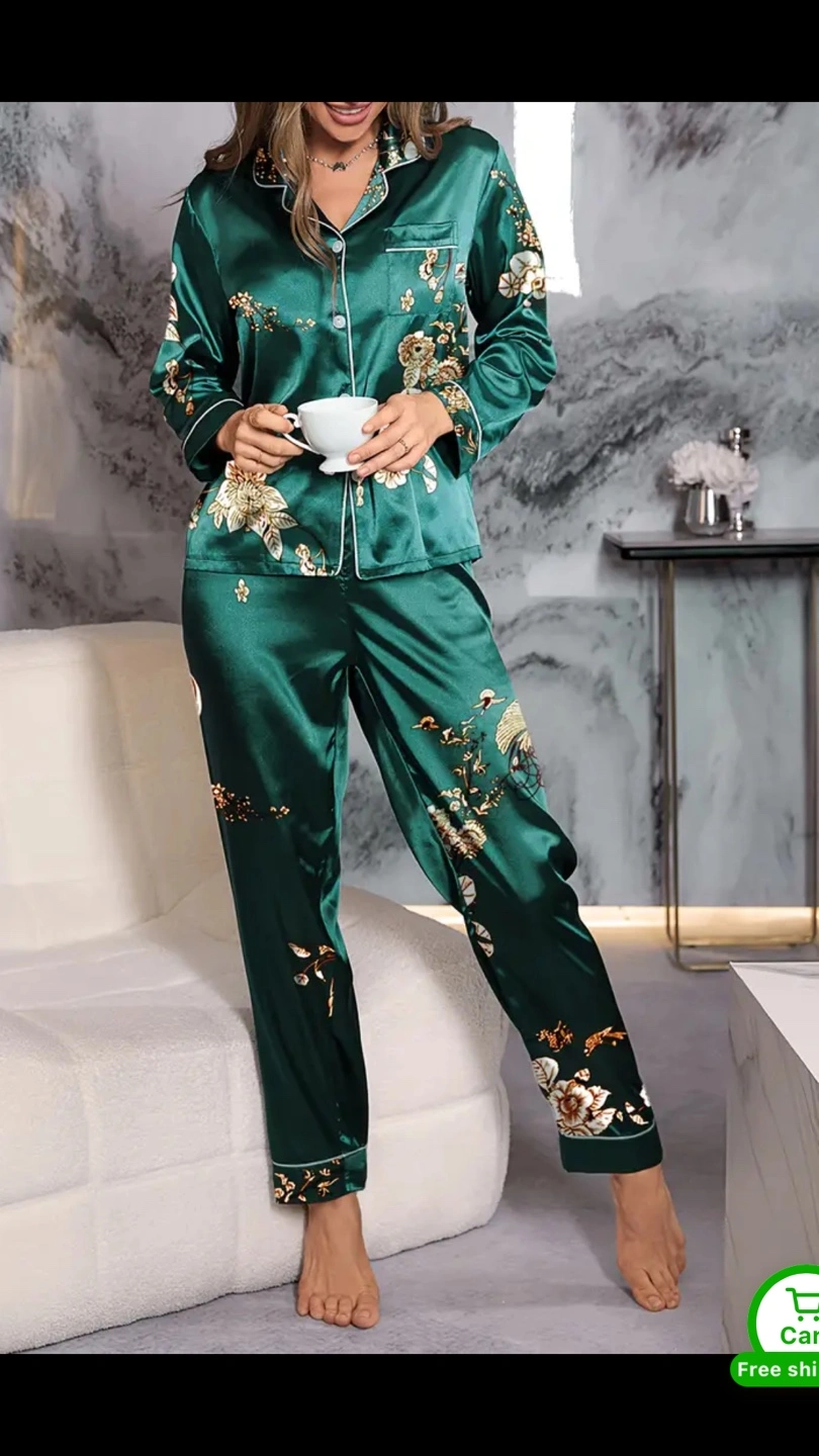 18Selling a beautiful green satin pajama set with a floral design. The material is soft and comfortable, perfect for a relaxing night in. The set includes a button-down top and matching pants.