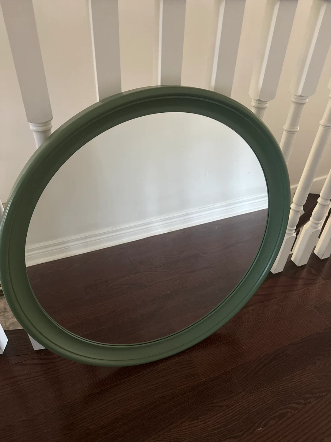 Selling a lovely round mirror with a green frame! It's in great shape and would look wonderful in any room. The colour is a nice muted green.