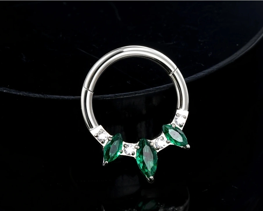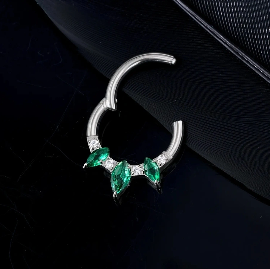 25Selling a nose ring with green gems! It's made of ASTM F-136 Titanium and has a high polished finish with green Marqueis Cubic Zirconia stones. 100%Pure Titanium with silver plating. buy one get one free. 2 for 1.