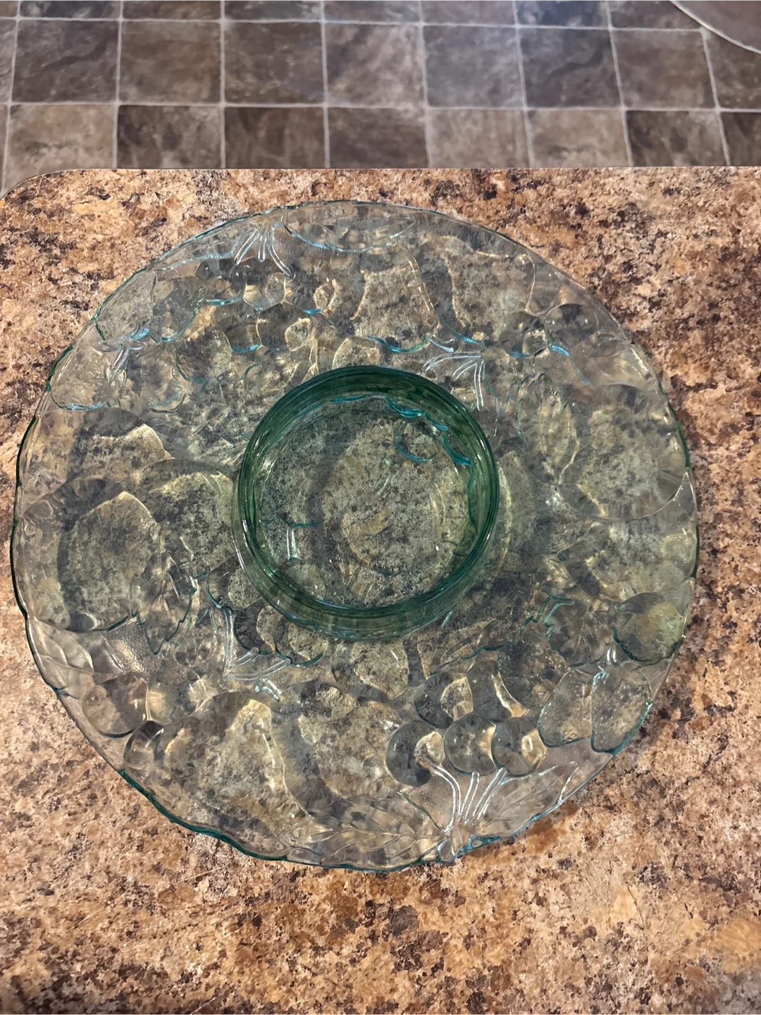 65Selling a lovely green glass serving platter! It's in great shape and perfect for serving snacks or appetizers at your next gathering. The design is quite unique and would look great on any table.
