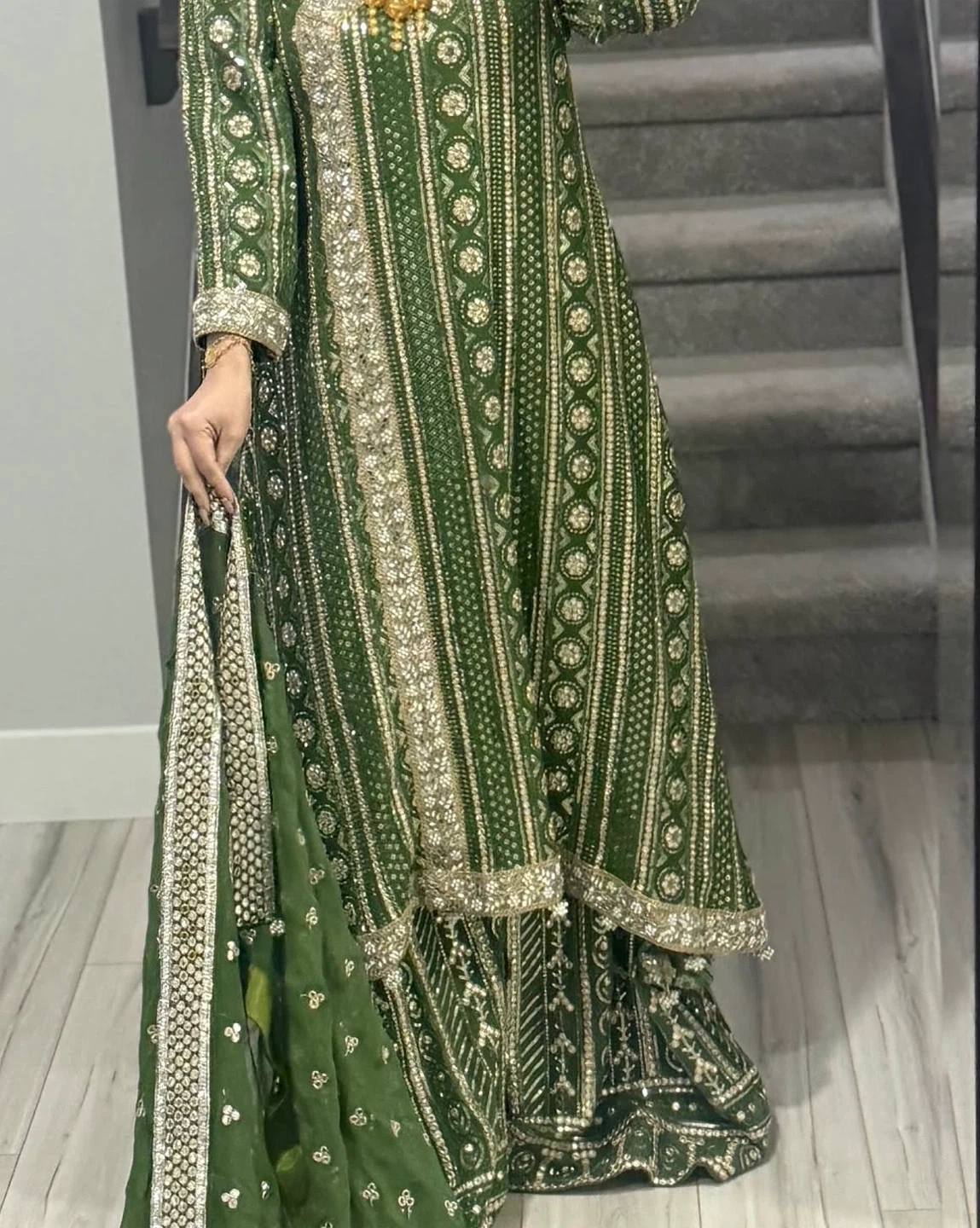 56Beautiful green and gold embellished Pakistani suit! The intricate detailing and vibrant colours make it perfect for special occasions. It's in great condition and ready for a new home. Feel free to message me with any questions! All sizes are available