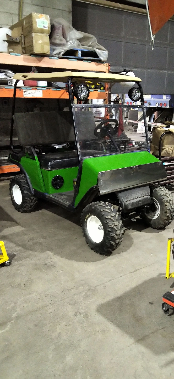 Selling a green golf cart. It has a black seat and a windshield. The tires are off road . high mounted lights. radio and speakers Bluetooth. converted to gas engine.