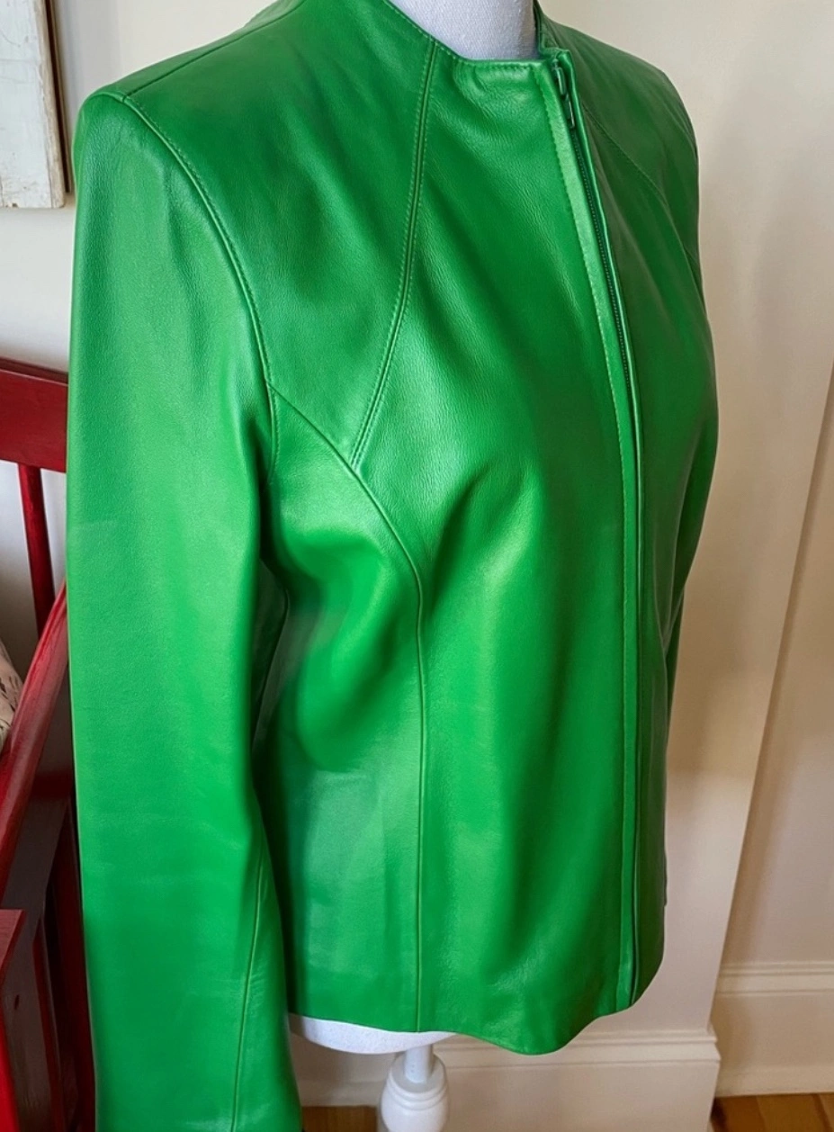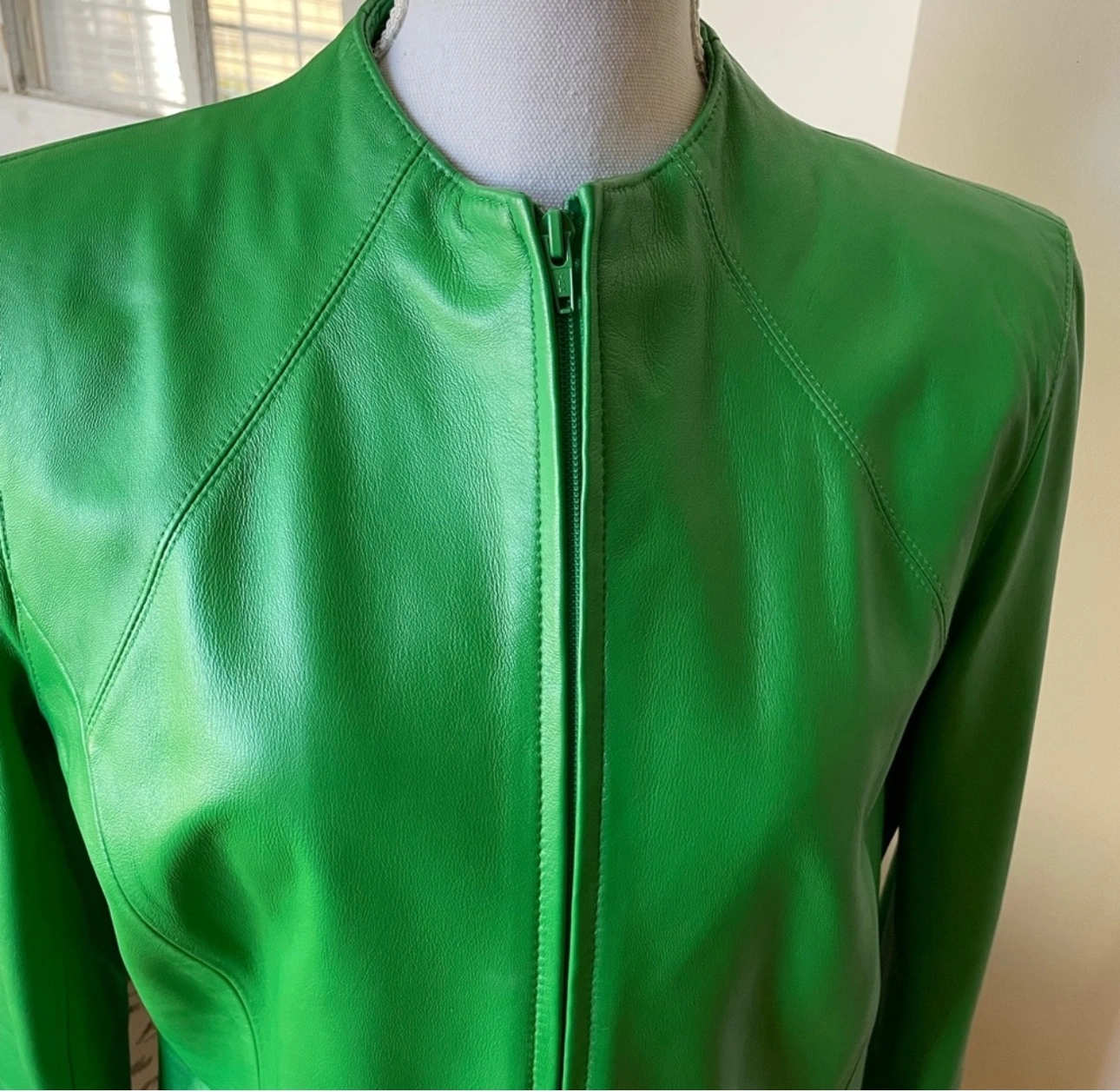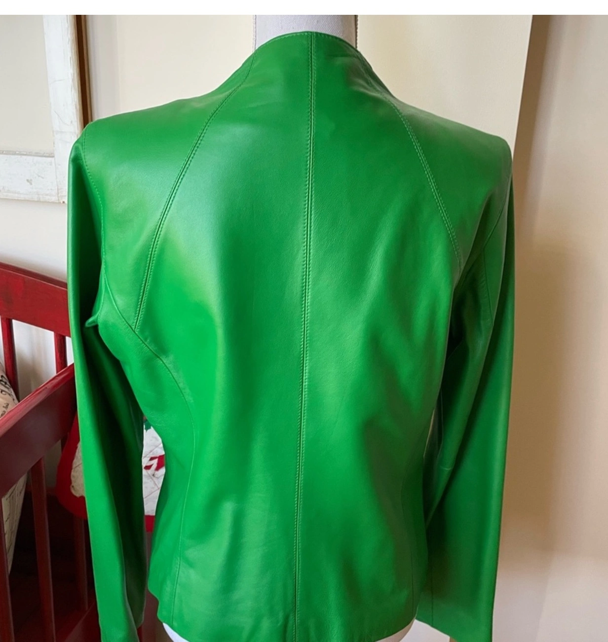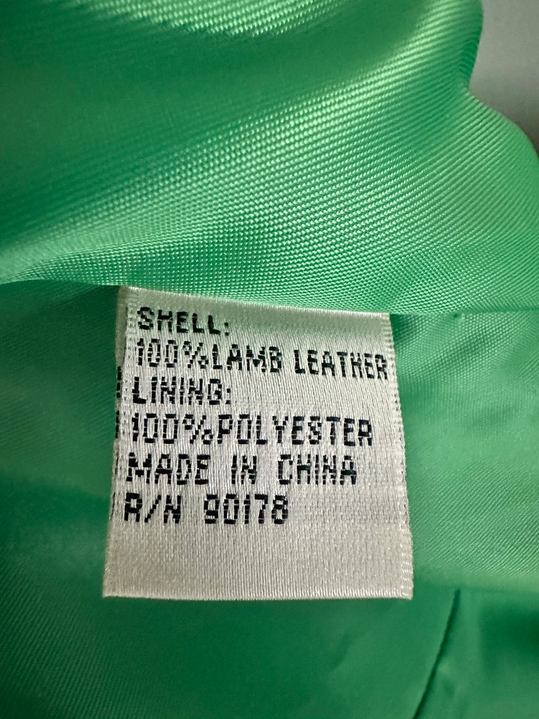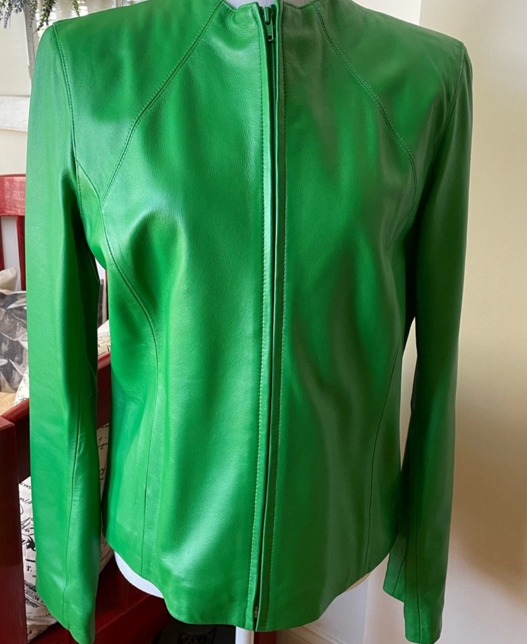 584This is a soft green leather jacket. It is a size medium.size US 8. 100% genuine lamb leather.