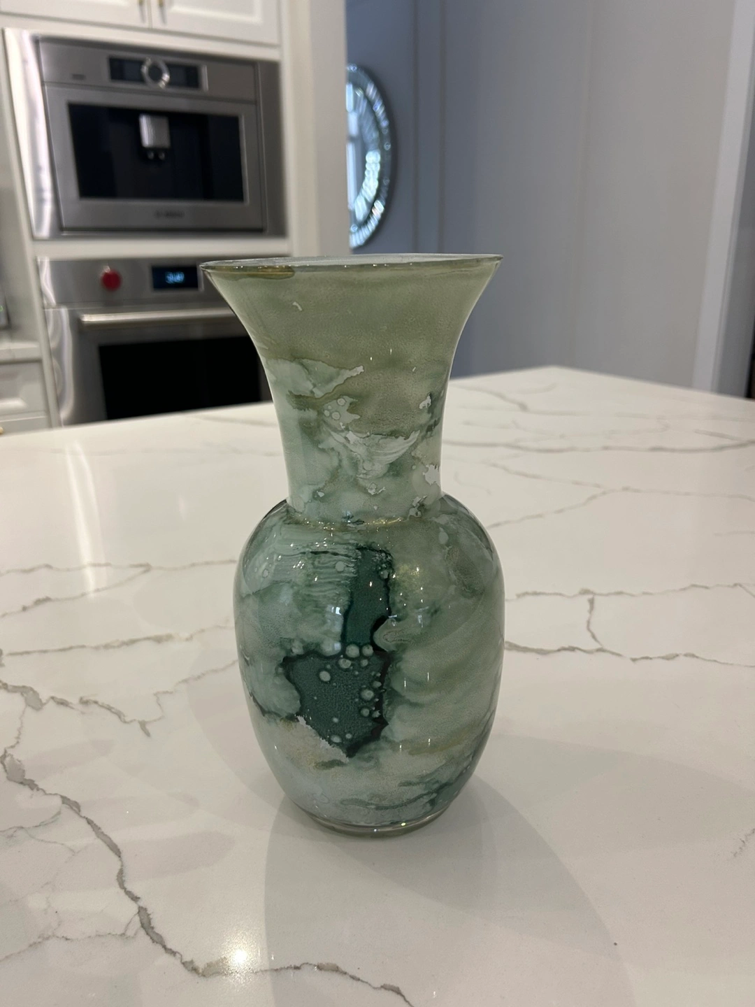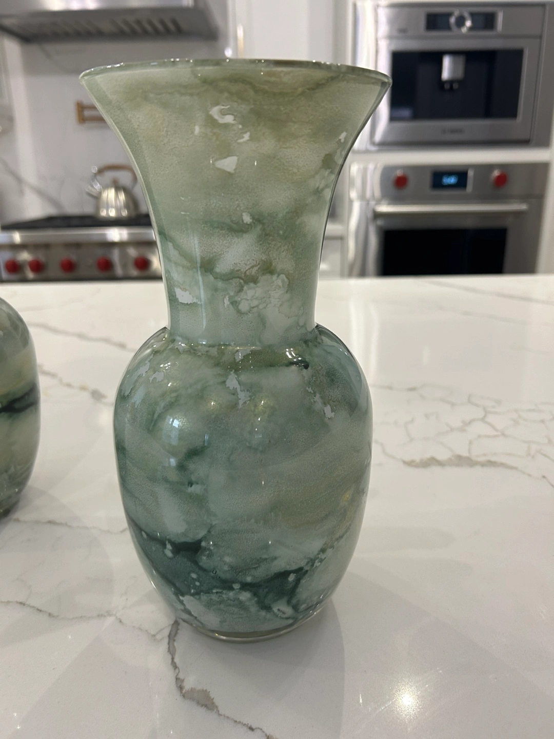 Beautiful pair of glass vases. Green and white marble pattern. Unique design. Perfect for home decor. One for $15 2for $25