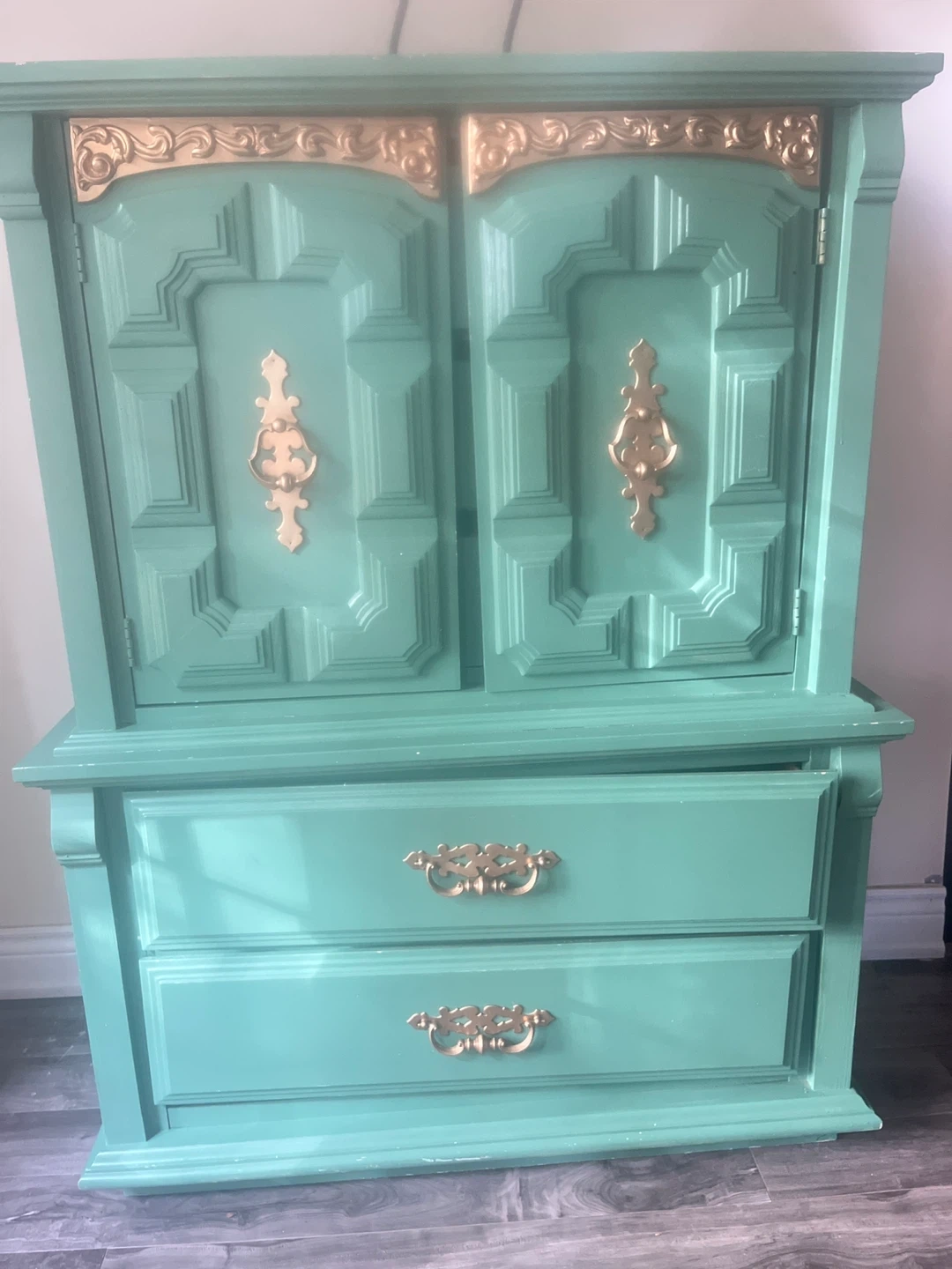 70Here's a charming green painted armoire! It features a unique design with gold hardware and detailing. It has a combination of drawers and cabinet space, making it a practical and stylish storage solution for any room in your home