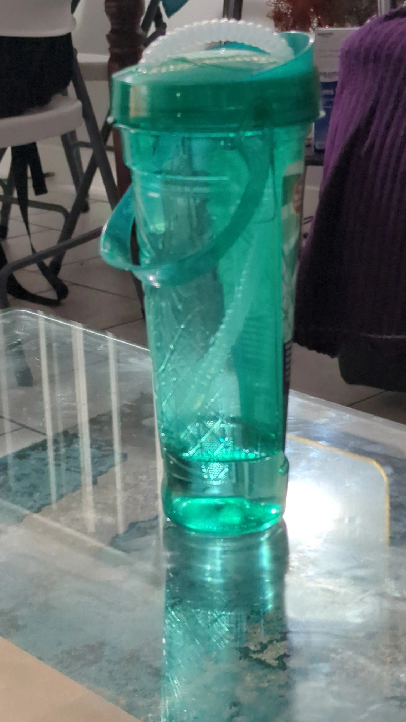 Selling a green plastic water bottle with a straw. It's in good condition and ready for a new home. Perfect for staying hydrated on the go!