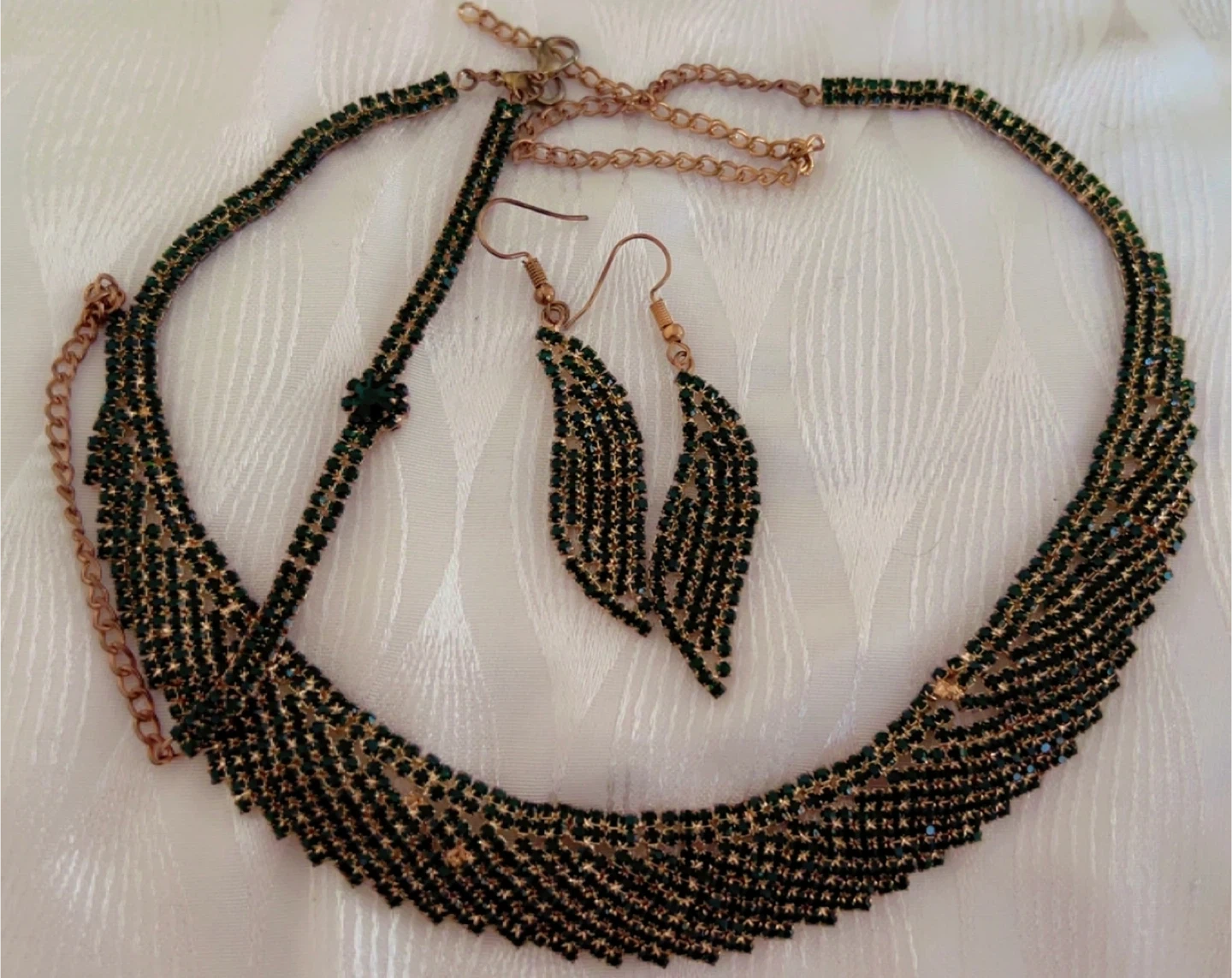 10Here's a lovely necklace and earring set! It features a beautiful design with green rhinestones and gold-tone metal accents. It's perfect for adding a touch of sparkle to any outfit