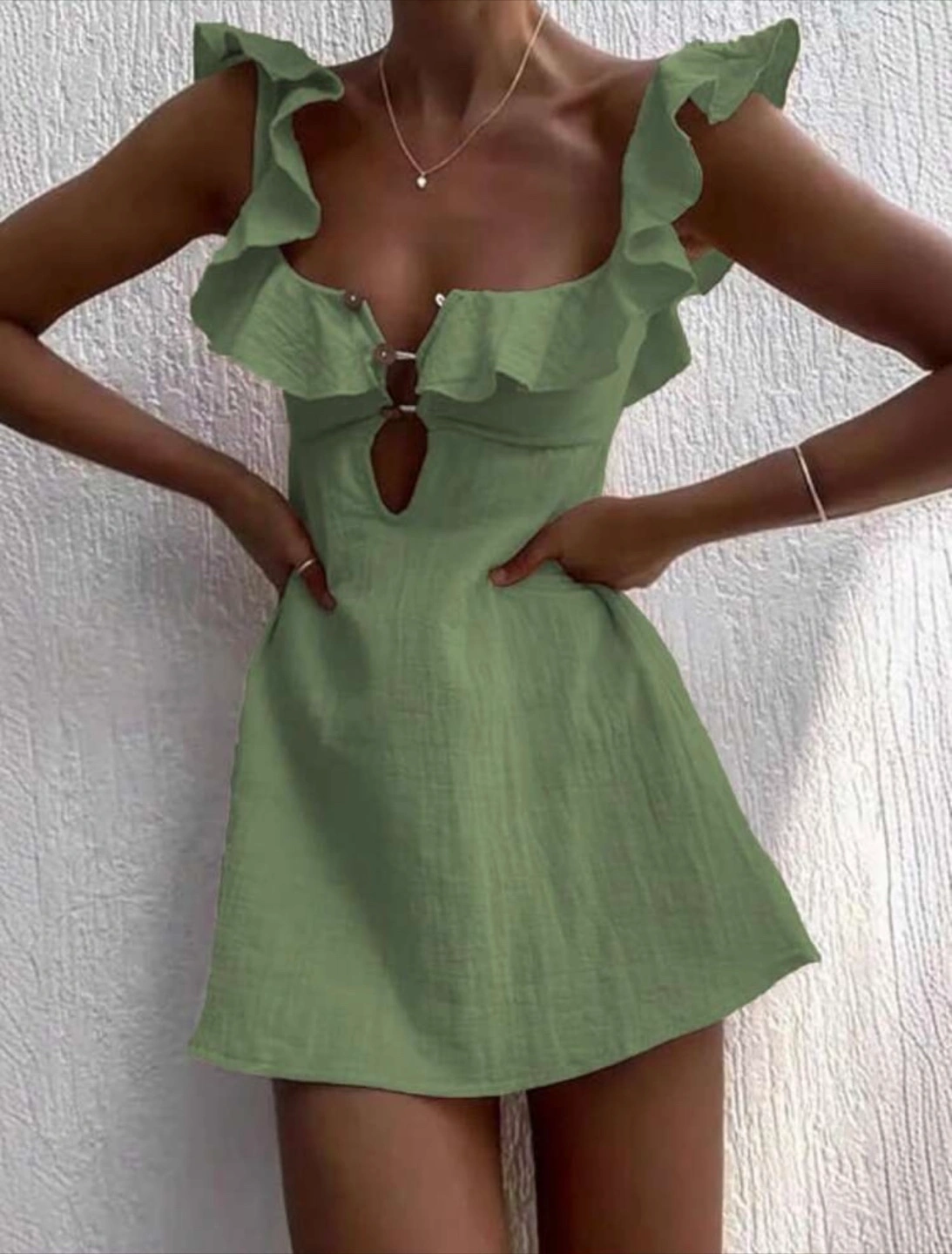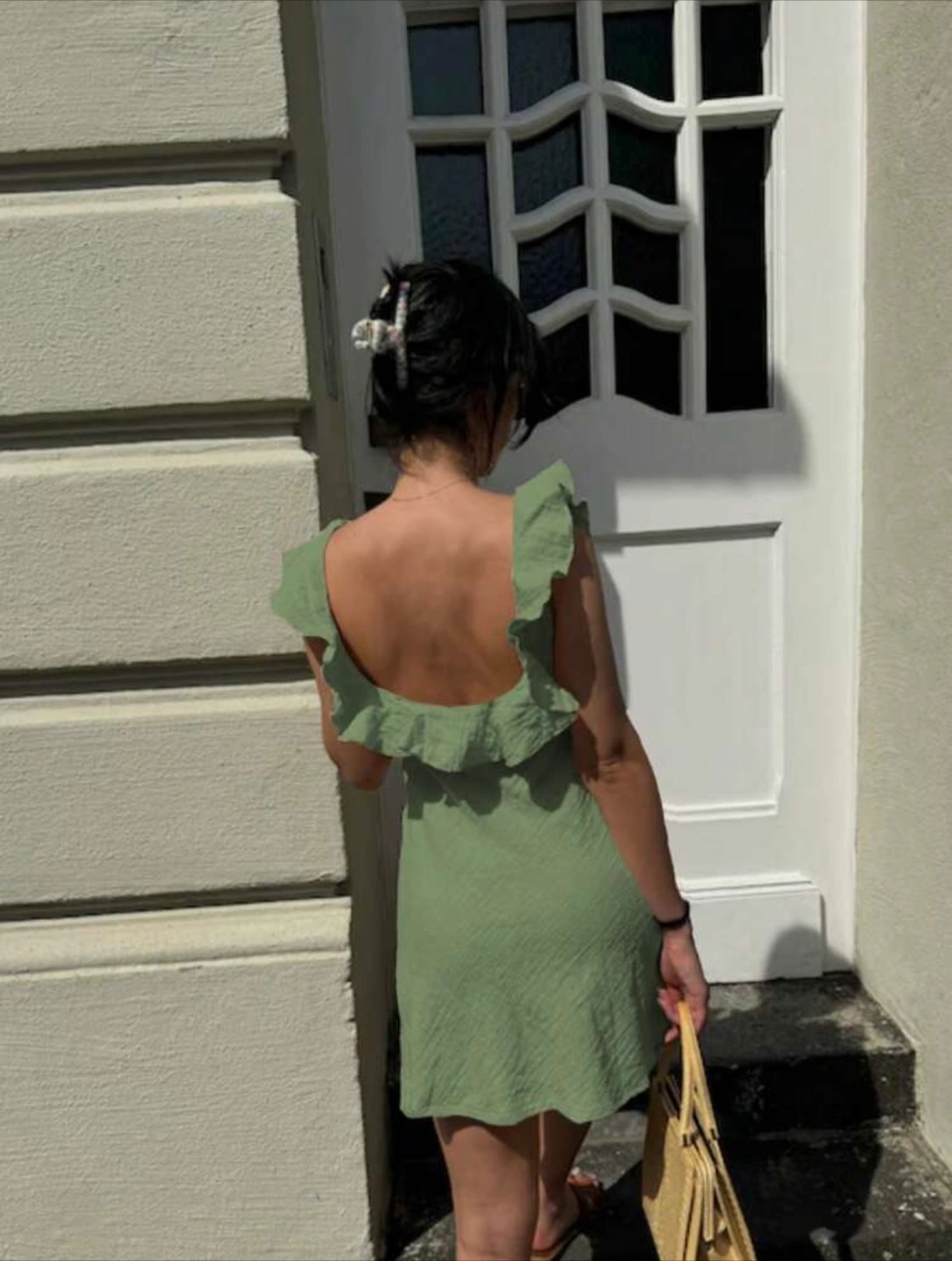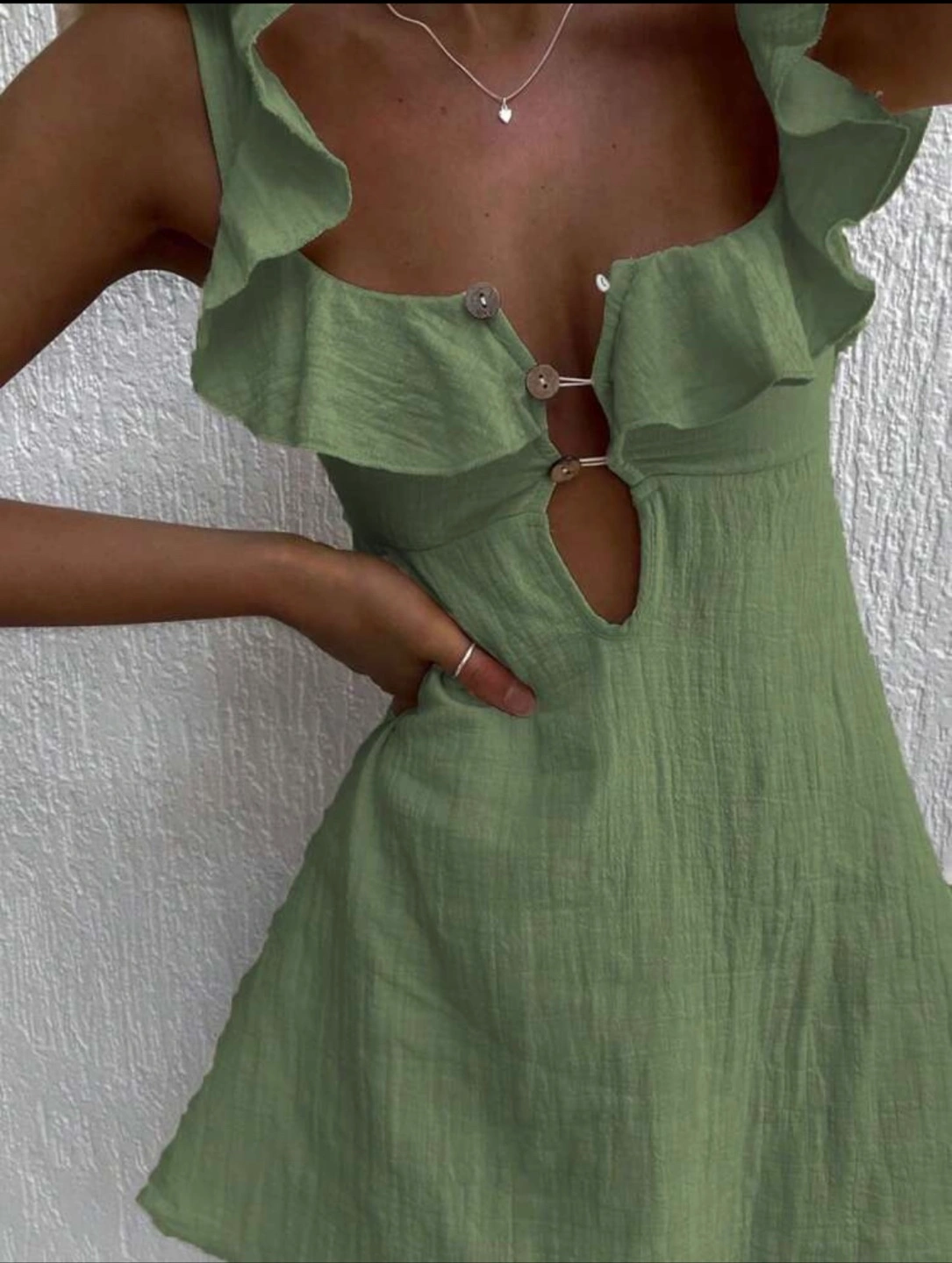 Cute green mini dress with ruffle detailing on the straps and neckline. Perfect for summer! It’s a L size but fits like M
