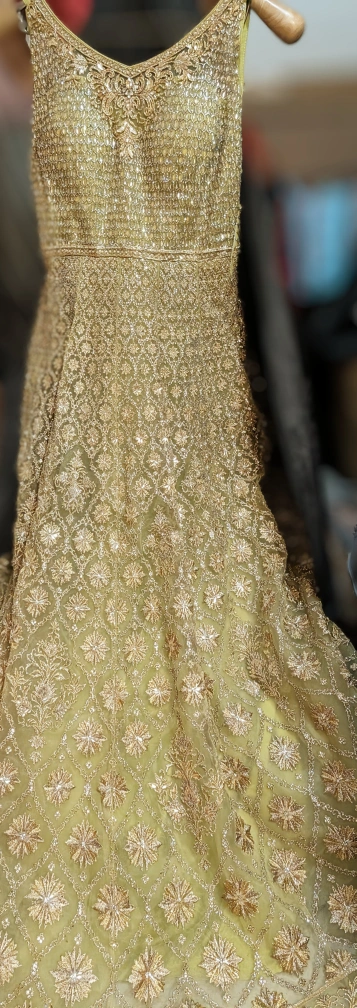 Green sequin and embroidered dress with a matching dupatta. The dress is sleeveless and has a V-neck. The dupatta is sheer with gold embroidery. Only worn once, anyone can wear it with height up to 5'9. Length is not altered, also has margins on the sides for alterations.