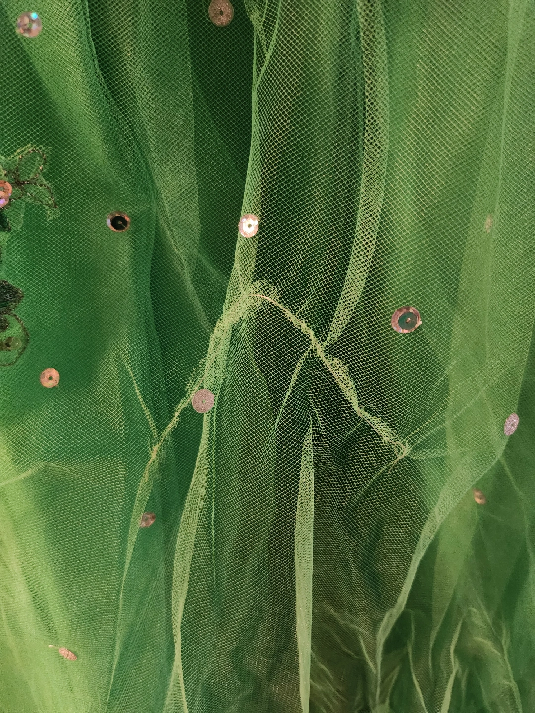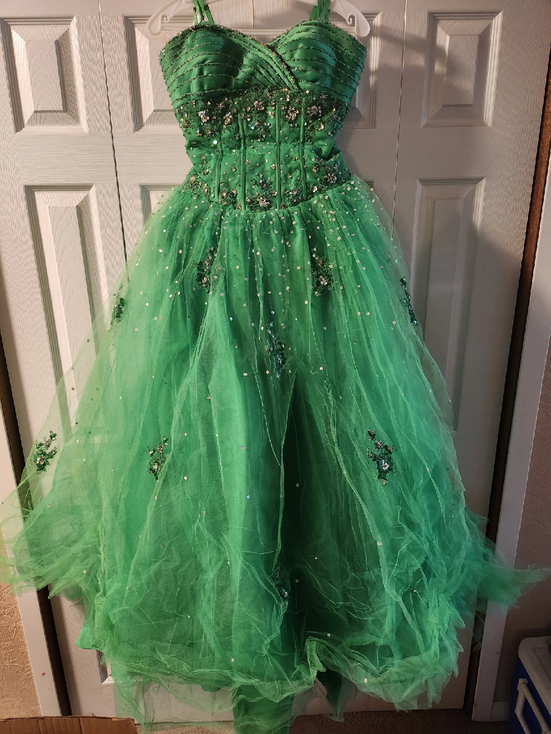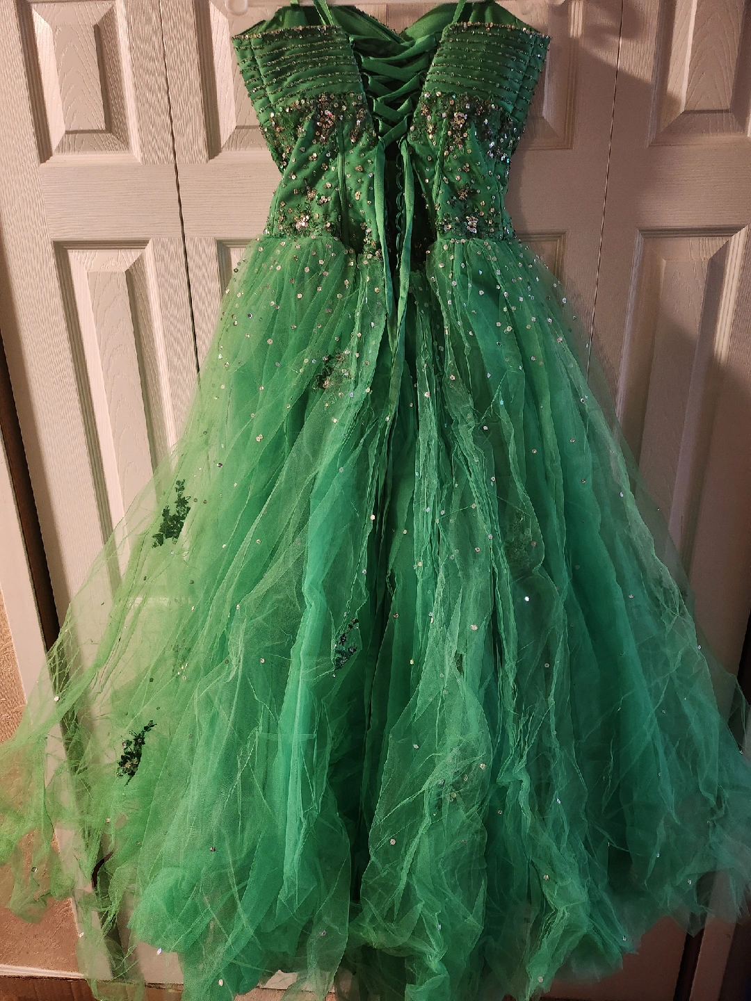 10Beautiful green dress with a corset top and sequin detailing! The dress features a tulle skirt and lace-up back. Bought for $500+ asking $250 OBO Needs repairs, selling as is.
