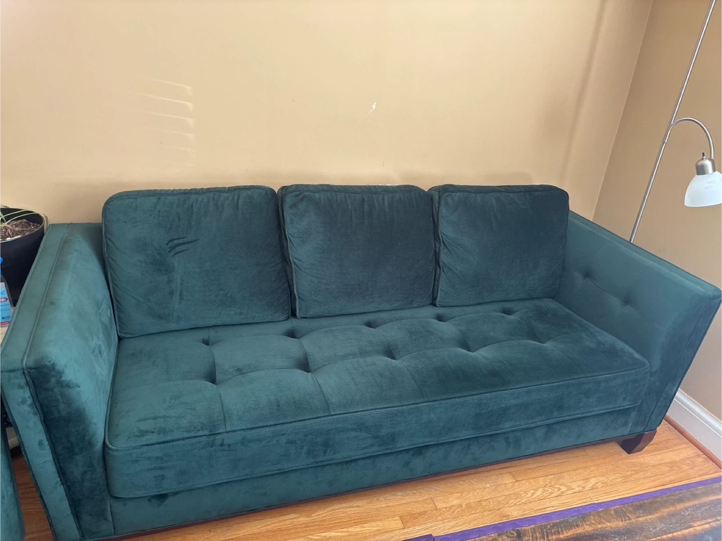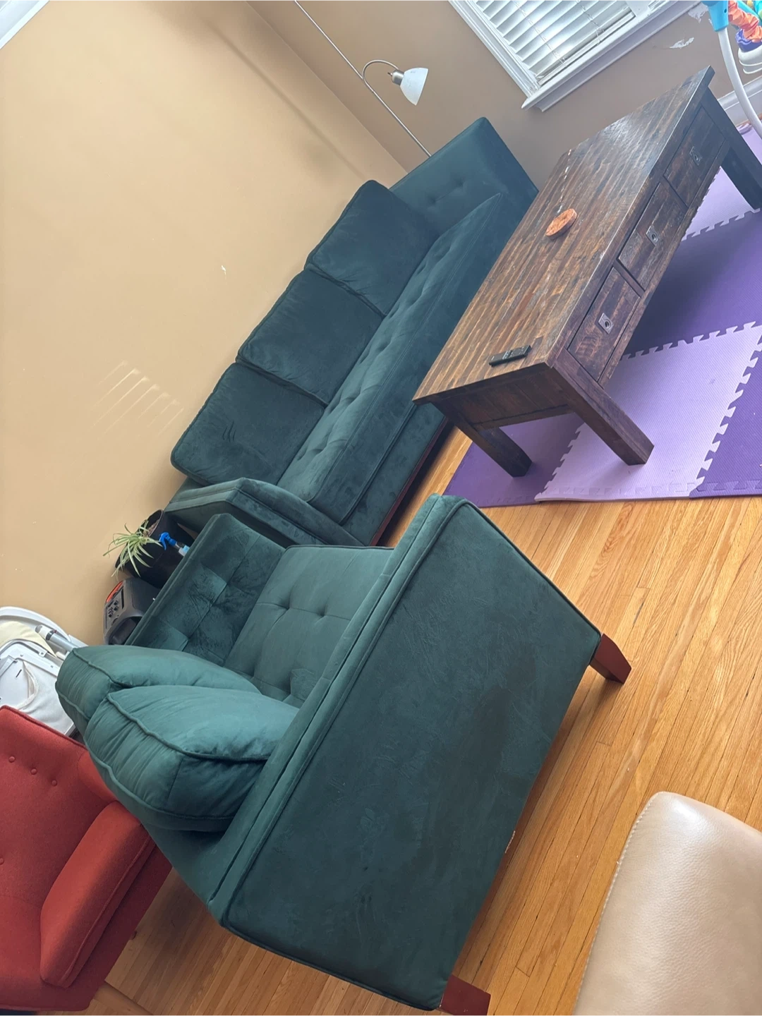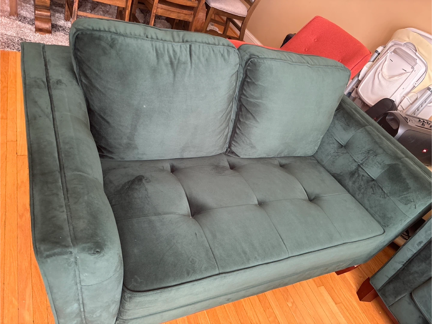 15Selling a comfy green sofa and loveseat set! This set would be perfect for a living room or den. The cushions are soft and supportive, making it a great place to relax after a long day. It's in good condition and ready for a new home