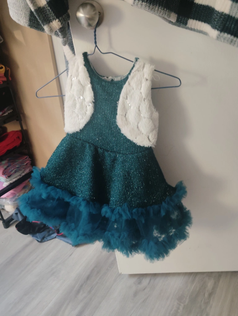 A cute green sparkly dress with a white faux fur vest! The dress has a ruffled tulle hem. Perfect for a special occasion or dress-up!