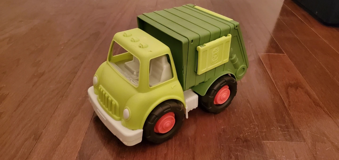 65Toy garbage truck in good condition! The truck is green and features red and black wheels. Perfect for kids who love trucks and playing pretend