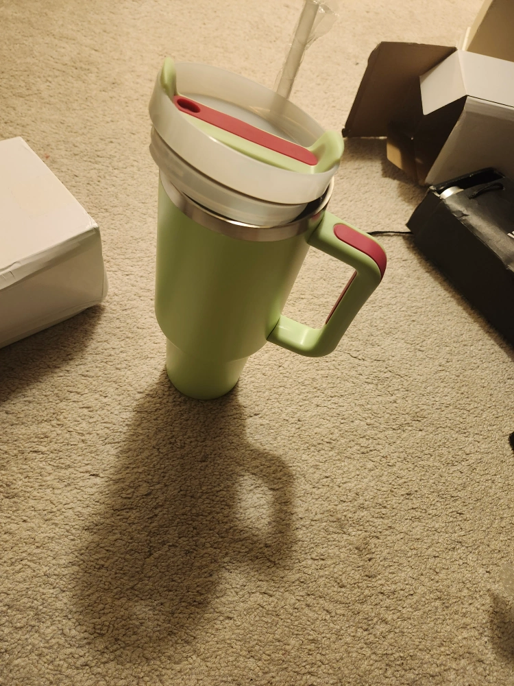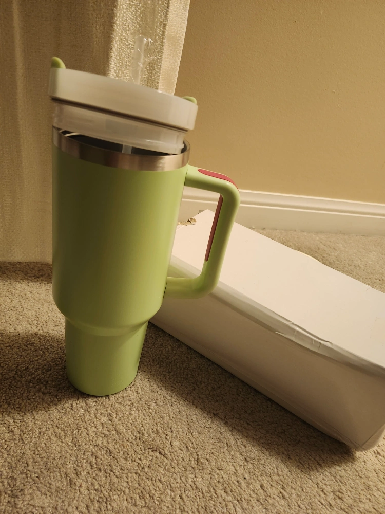 12Stainless steel tumbler with a green powder coat finish. Features a lid with a straw hole and a handle. Includes a straw.