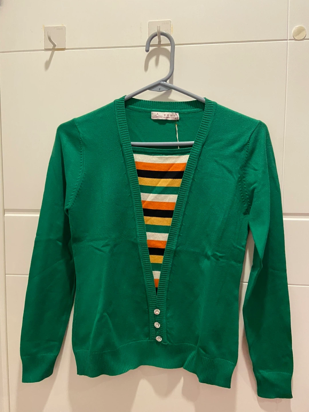 A lovely green V-neck cardigan! It features three decorative buttons and looks great over a striped top or any other outfit you choose
