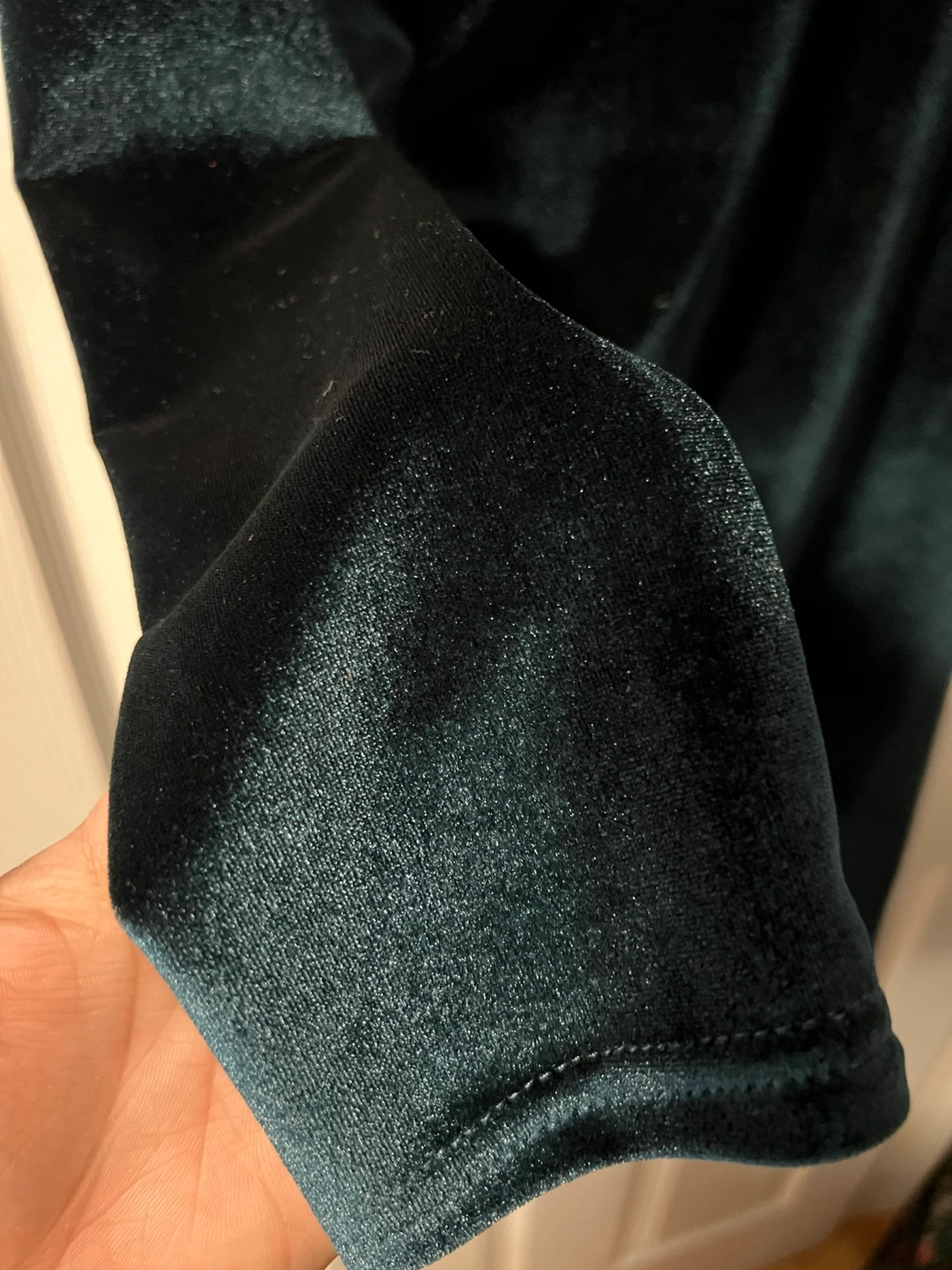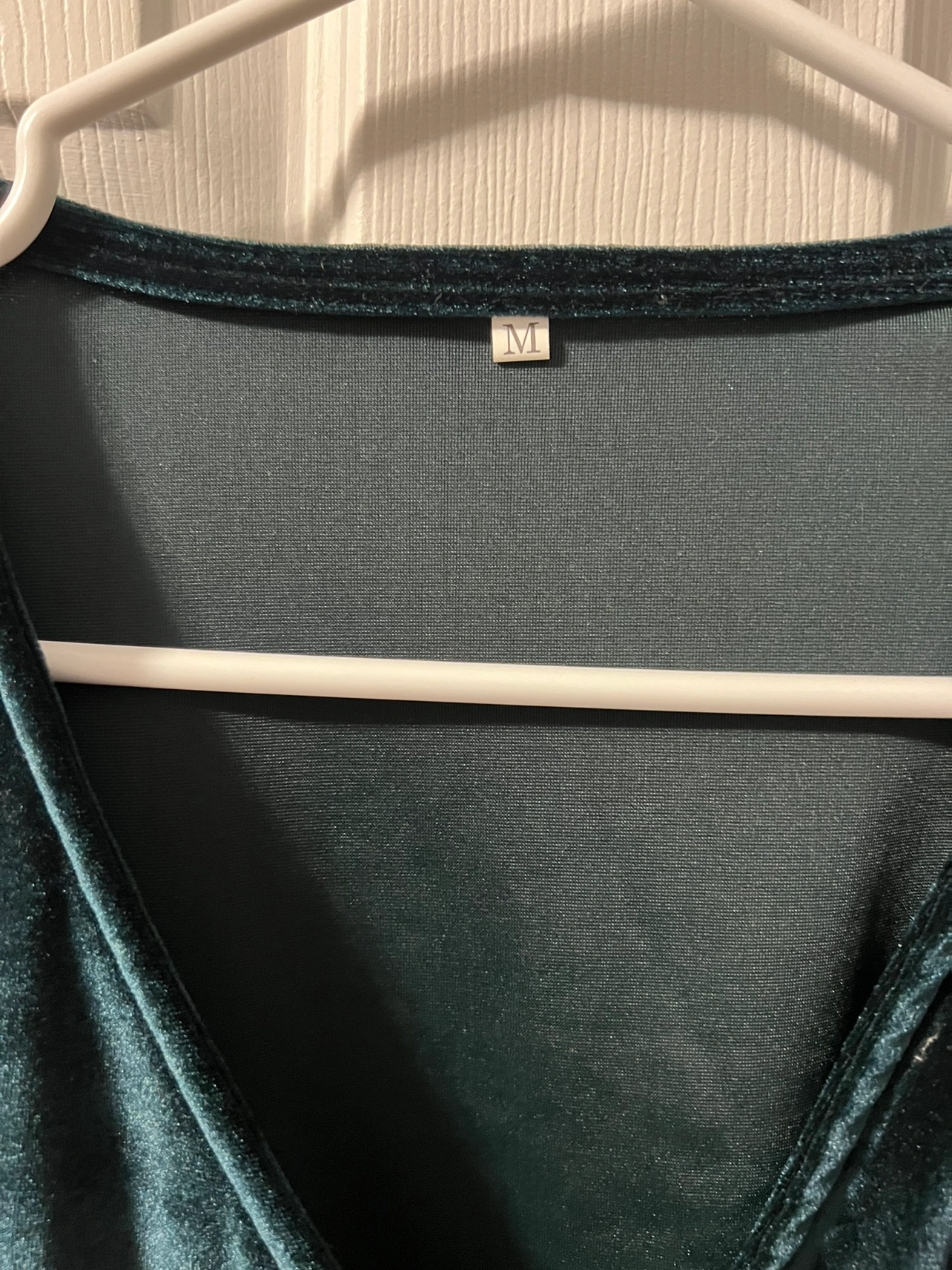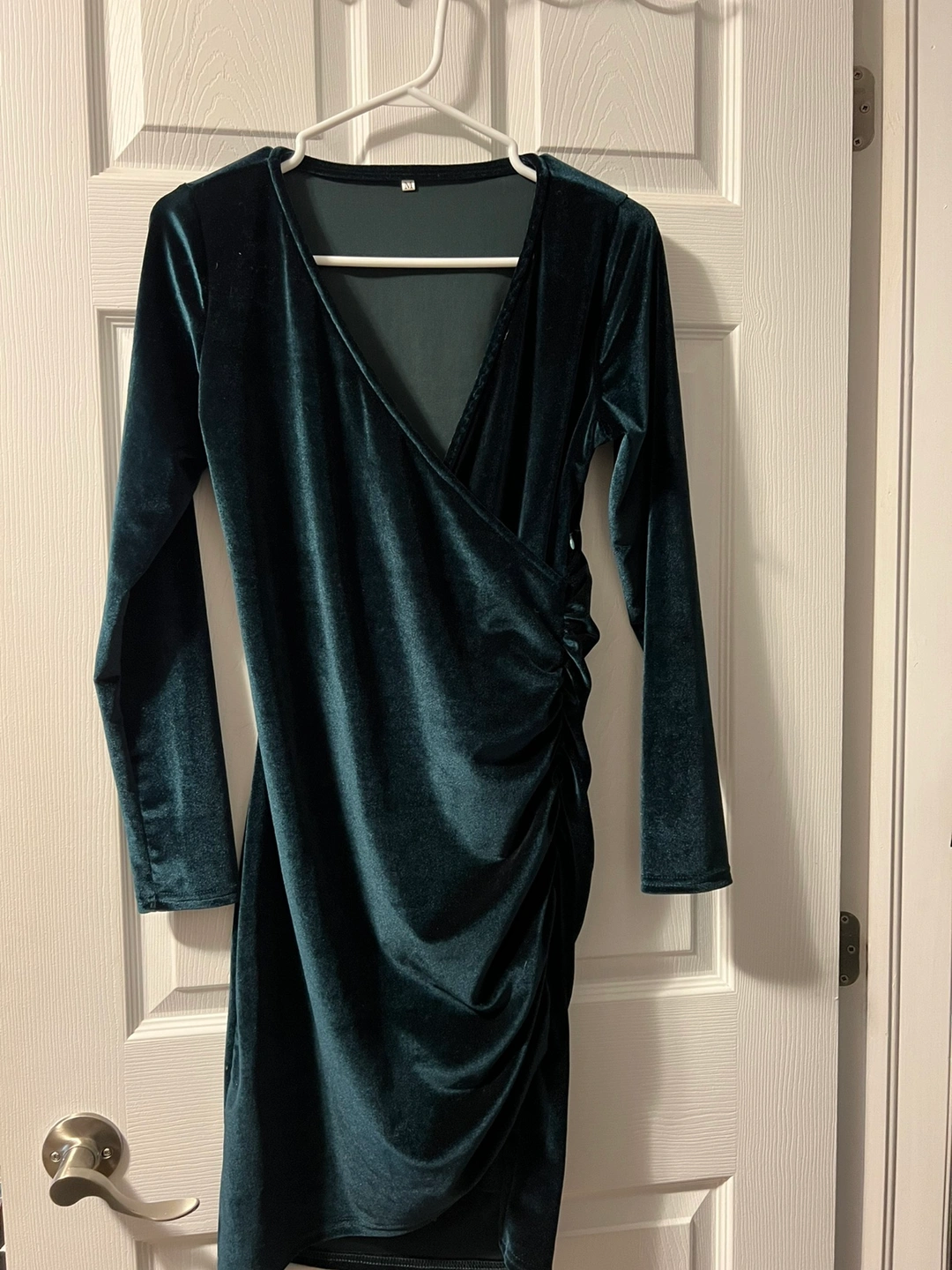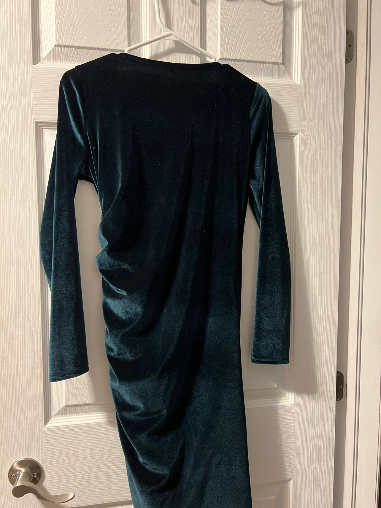 Long-sleeved, dark green velvet dress. The dress has a V-neckline and is form-fitting. It is a midi-length dress and would be great for a night out or an upcoming holiday party. Worn once.