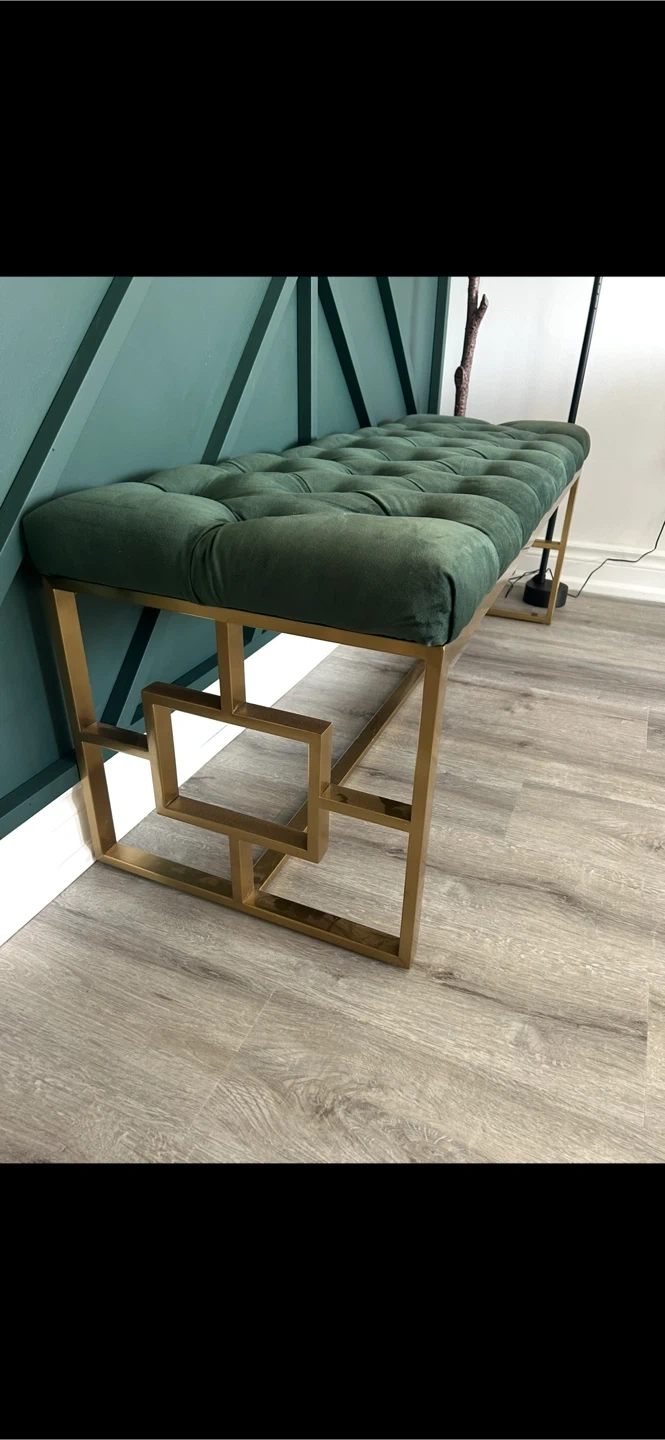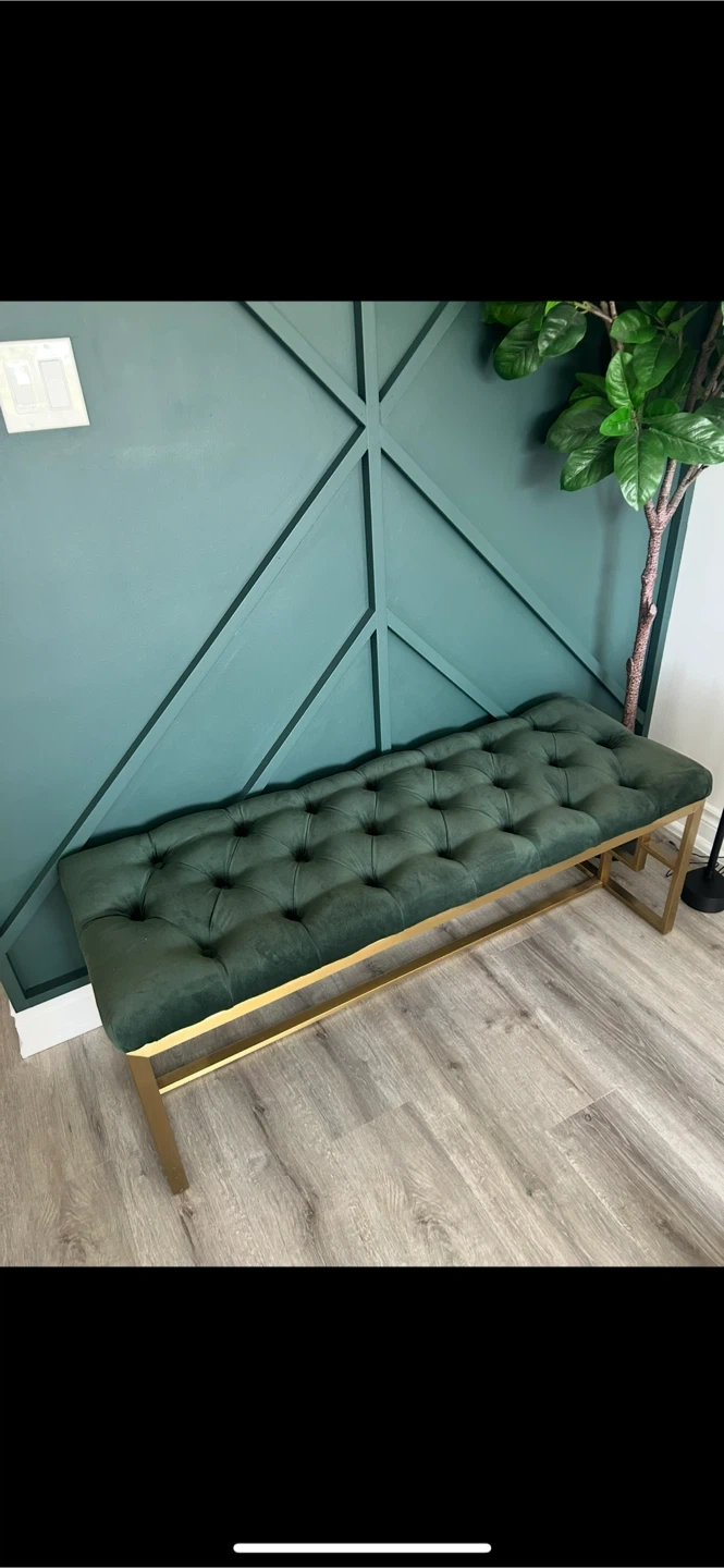 Looking to add a touch of elegance to your entryway or living space? I'm selling a beautiful green velvet tufted bench. It features a stylish gold frame that complements the rich velvet upholstery perfectly. This bench is in great condition and ready to enhance any room with its sophisticated charm. Heavy duty frame and fabric.