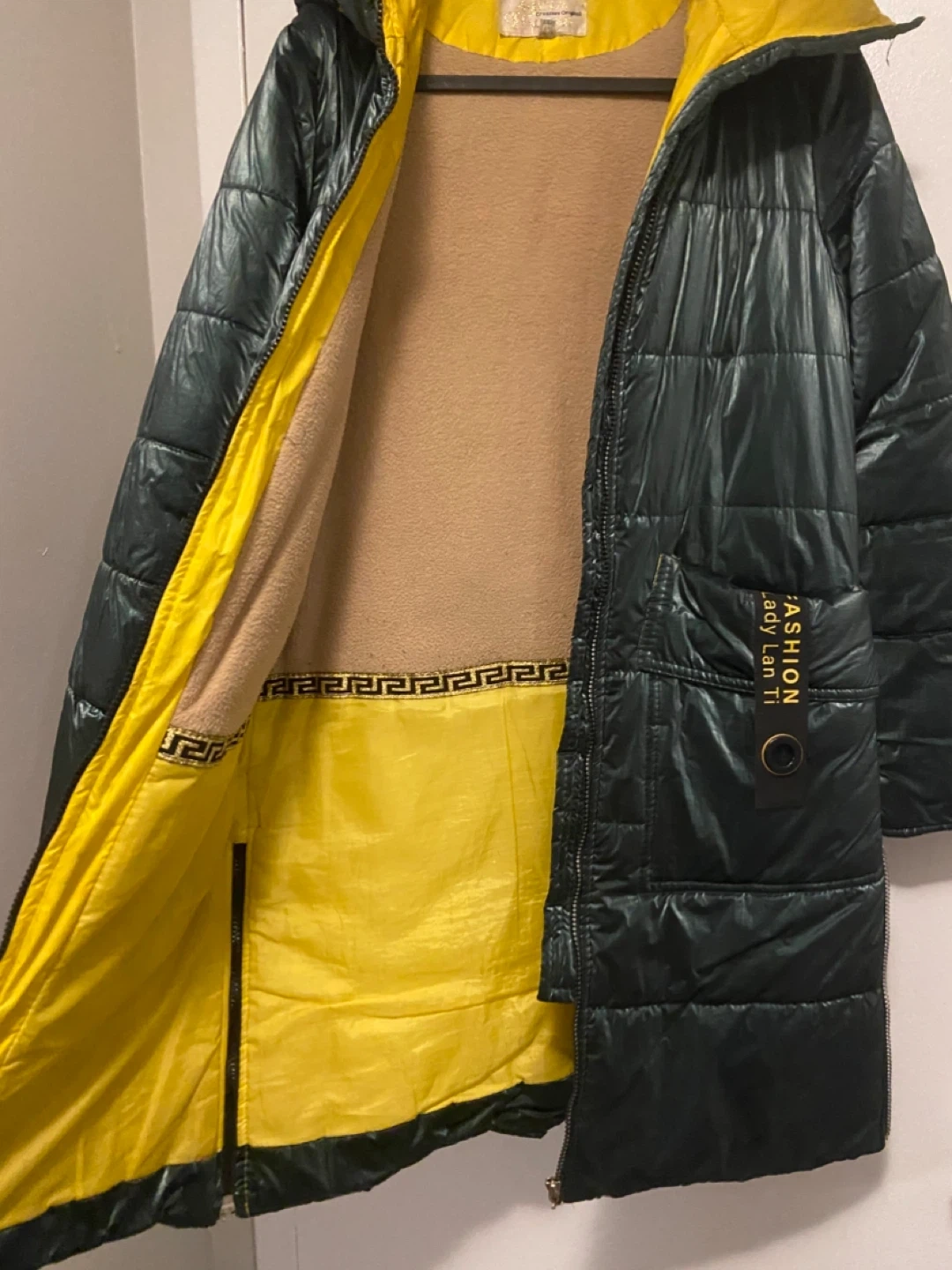 22I'm selling a stylish puffer jacket featuring a unique green and yellow colour scheme. It's in great condition and ready for a new home! The jacket has a hood and a zip-up front, perfect for staying warm on chilly days