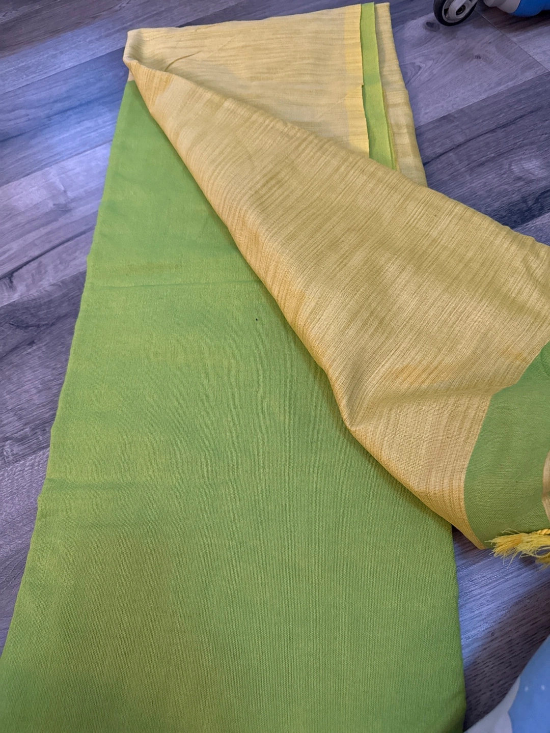 Selling a lovely green and yellow cotton handloom saree. It's in great condition and ready to add a pop of colour to your wardrobe! The scarf features a textured weave and fringe detailing.Great for gifting purpose too at a pocket pinch!