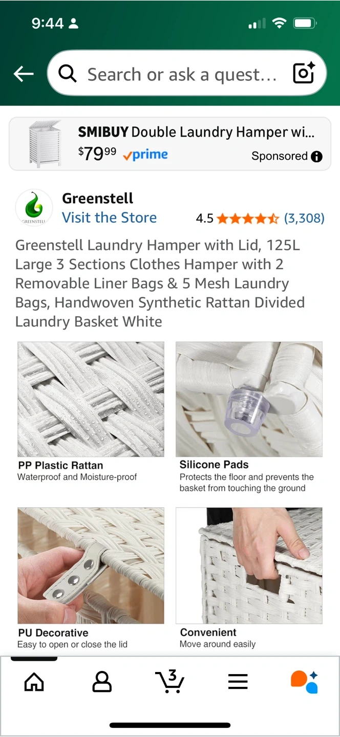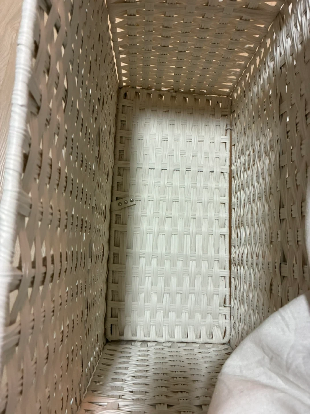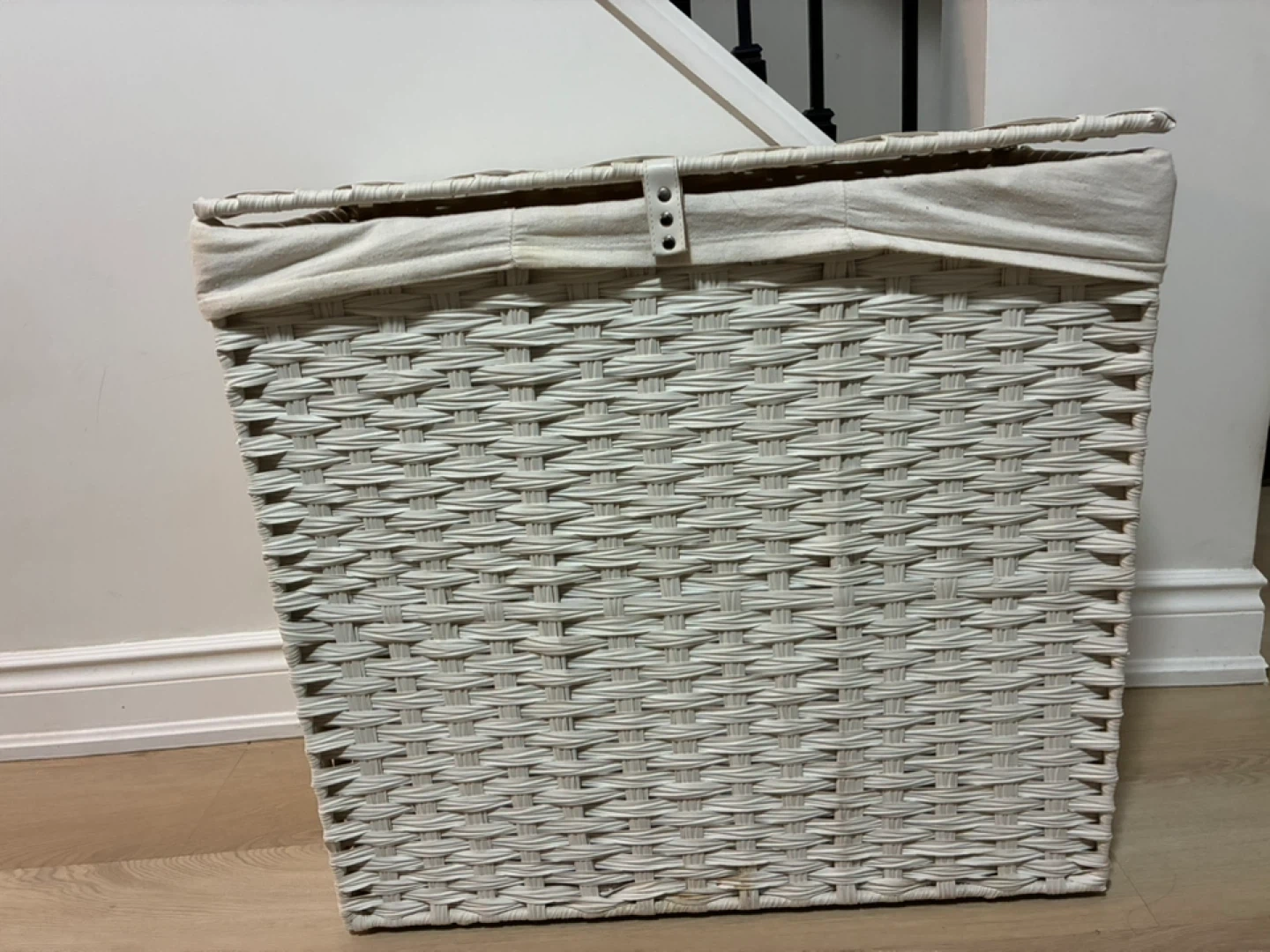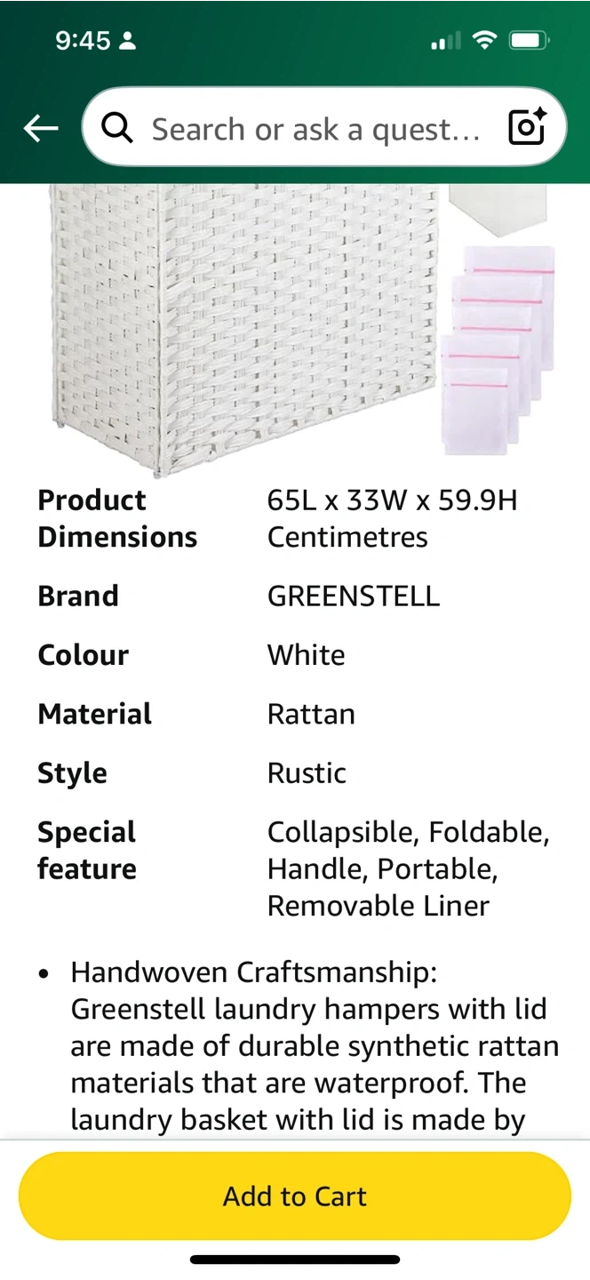60Selling a Greenstell laundry hamper! It's white and made of rattan. Dimensions are 65L x 33W x 59.9H centimetres. It has a rustic style and is collapsible, foldable, has handles, is portable and has a removable liner