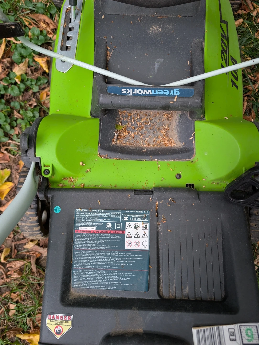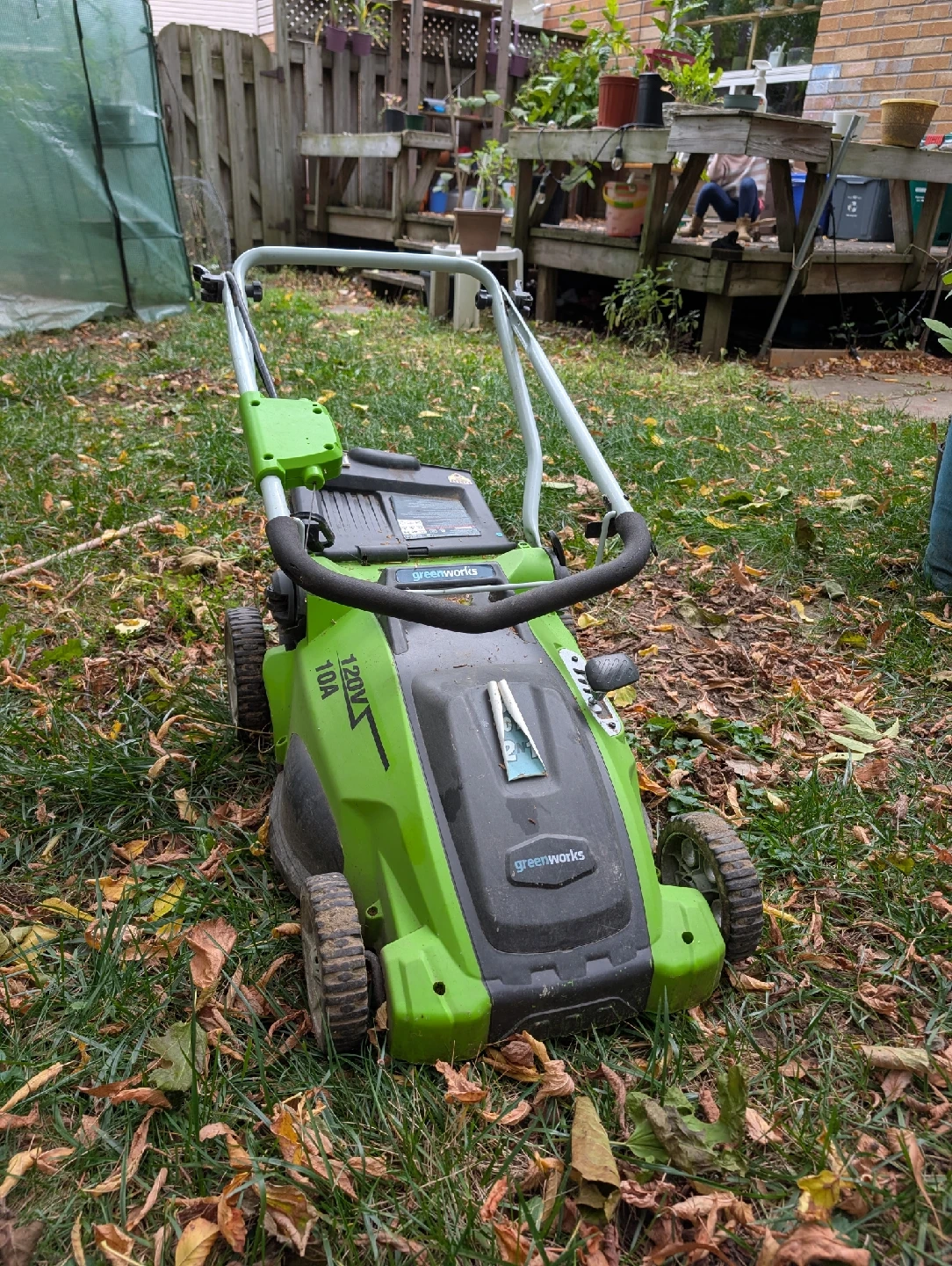 10Selling a Greenworks 120V 10A lawn mower. Doesn't have a bag for grass. In good condition, works perfectly fine.