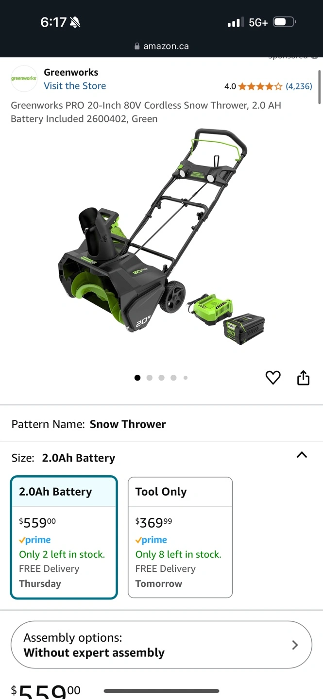 -173Used a few times before moving to condo, works perfectly like new in box. 20-inch snow thrower. 80V cordless. Includes battery. Easy assembly. Pickup: Midtown Retails for 550$+