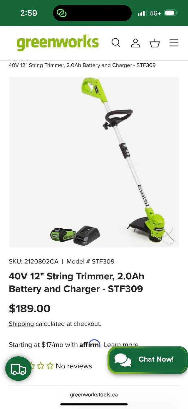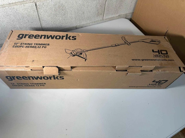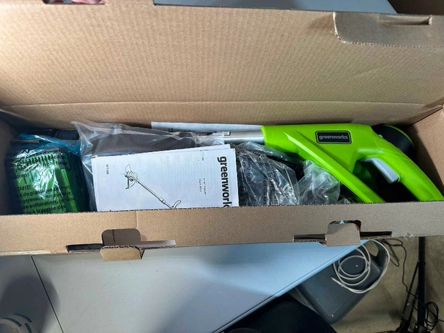 60Greenworks Cordless String Trimmer – 12" Battery-Powered Grass & Weed Trimmer (Battery & Charger Included). New (Open Box) Box opened but item unused — tested Brand: Greenworks Power Source: Battery Powered Color: 2117002CA Item Weight: 1.6 lbs Cutting Width: 12 inches (adjustable to 10”) Dimensions: 3.08L × 0.52W meters --- ⚡ PERFORMANCE: Responsive variable speed trigger delivers up to 9,200 RPM, letting you control the cutting power on the go — perfect for trimming around plants, fences, or tight areas. AUTO FEED SYSTEM: Automatic 0.065" single line feed ensures a consistent cutting line. Stop and restart the trimmer to extend the line easily. EDGING MADE EASY: Switch from trimming to edging in seconds with the 90° rotating shaft. Telescopic shaft lets you adjust the length for comfort and precision. LIGHTWEIGHT & ERGONOMIC: Weighs only 1.6 lbs — comfortable to handle, with an adjustable handle for reduced fatigue during longer use. COMPLETE SET: ✅ Trimmer ✅ Battery ✅ Charger — Everything you need to get started right out of the box! --- Perfect For: Homeowners, gardeners, and anyone needing a reliable, lightweight cordless trimmer.