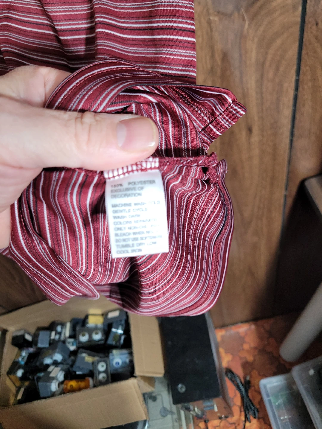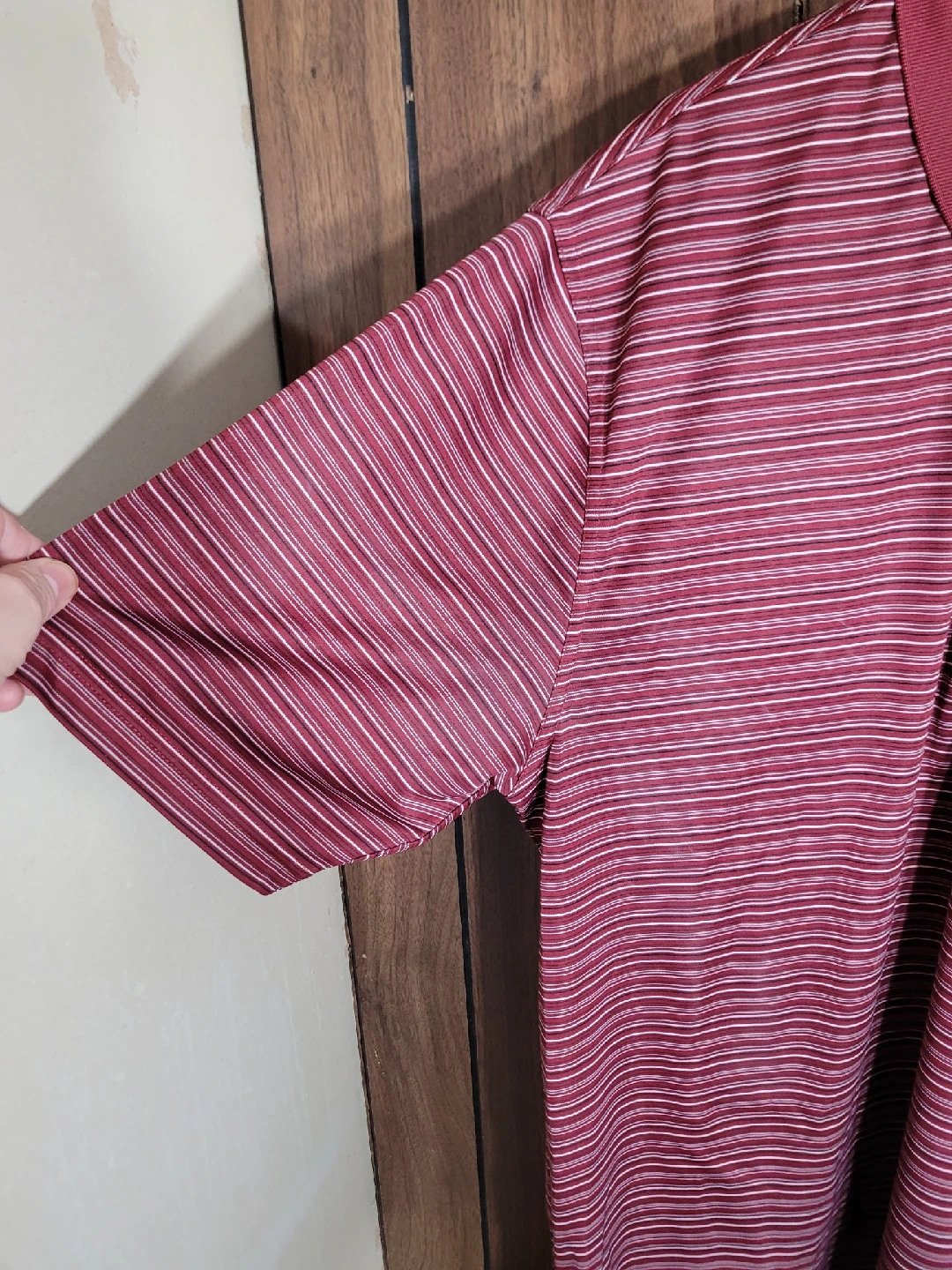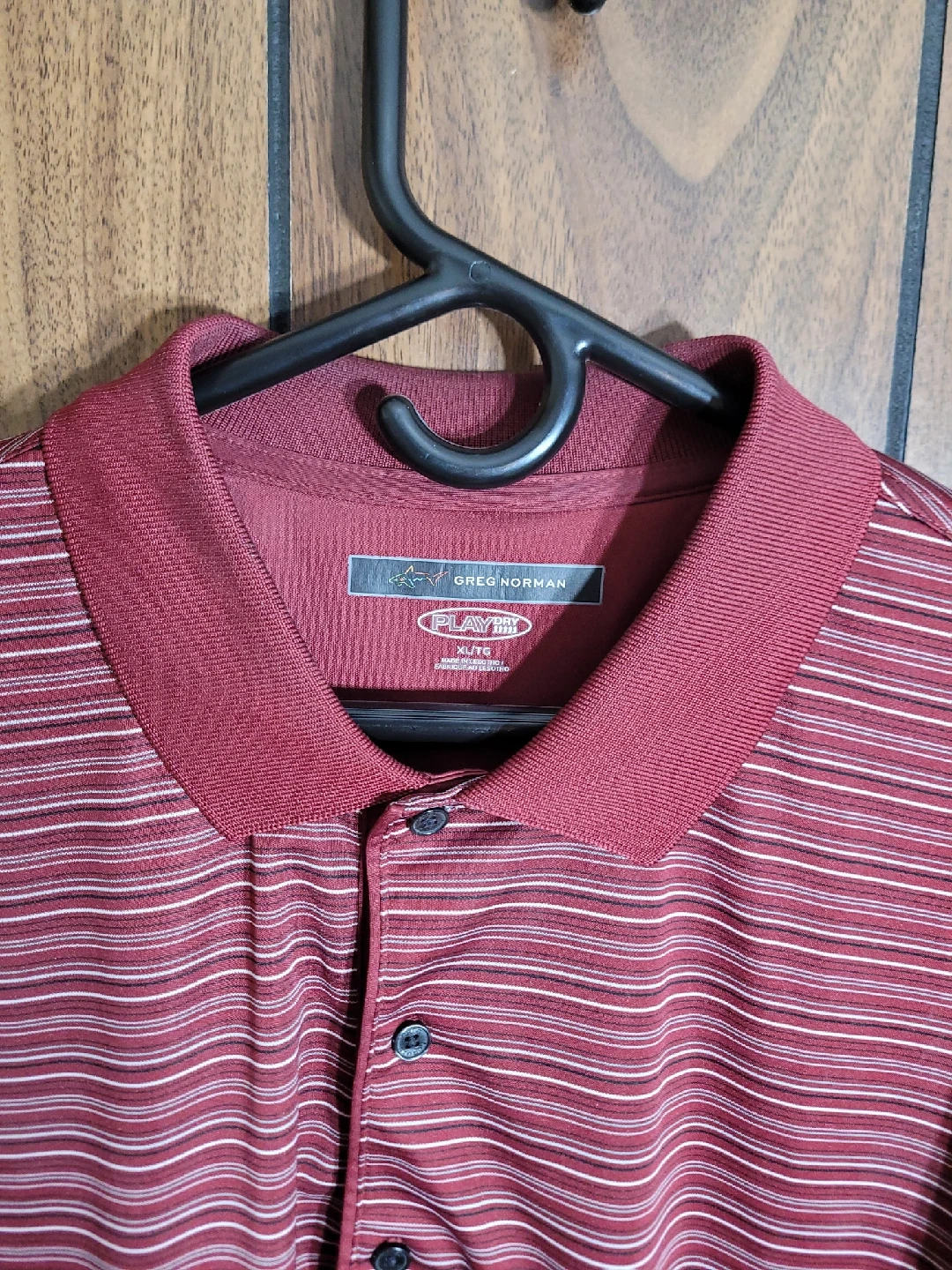 197Here's a Greg Norman PLAY DRY polo shirt in size XL/TG! It's a stylish burgundy colour with a horizontal striped pattern. Made from 100% polyester, it's lightweight and comfortable for everyday wear