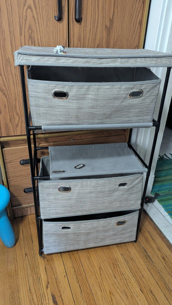 *All drawers included (4). still emptying the last drawer. Here's a handy storage unit with three drawers. It's in good condition (minus the 2 handles that have lost their back) and ready to help you organize your space! The drawers are a light grey colour and the frame is black and collapsible.