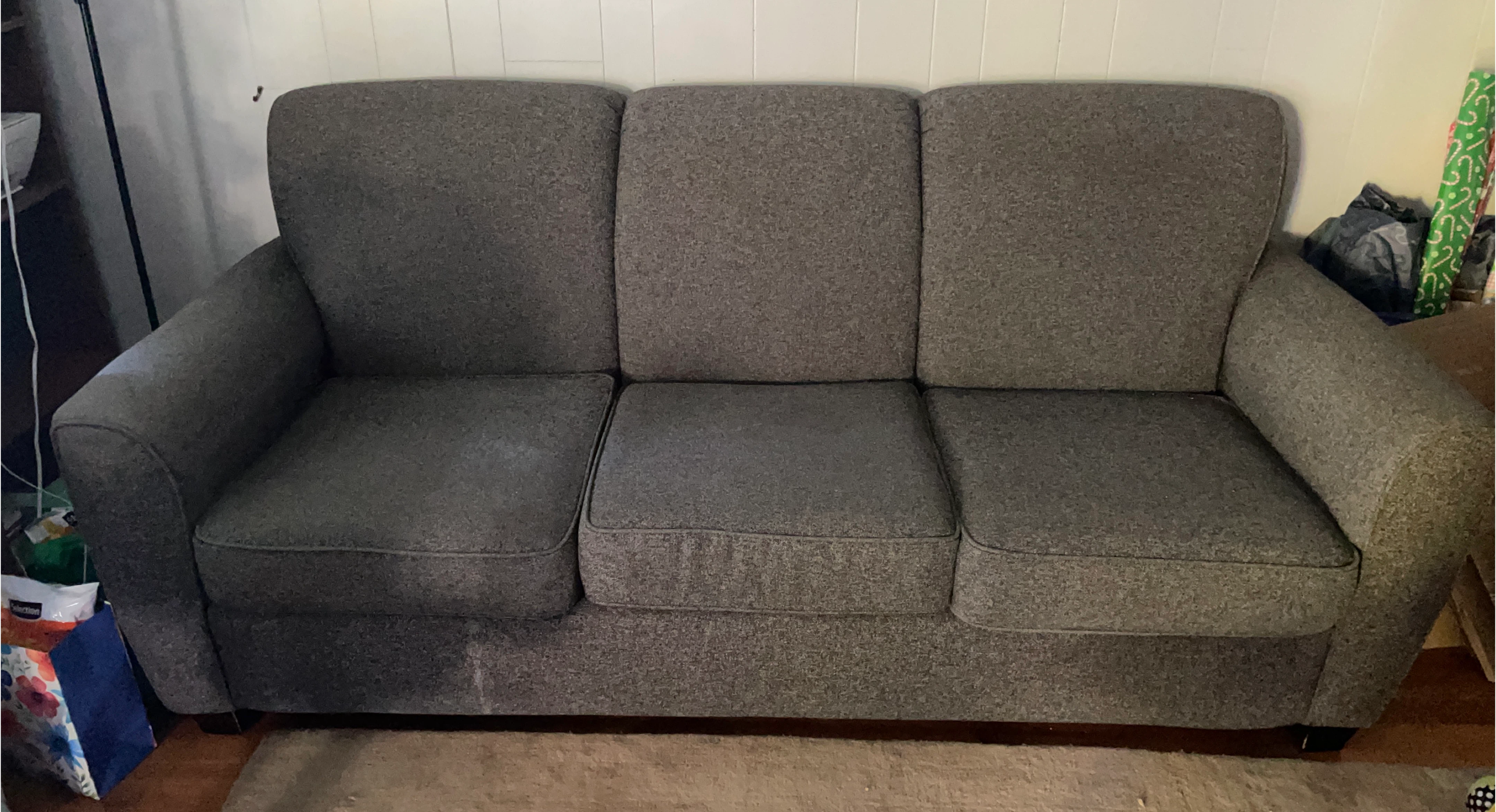 119Selling a comfy three-seater sofa in great condition! It's a stylish grey colour that would fit into any living room. The sofa is made with new materials only. There is a small candle stain.. Moving sale